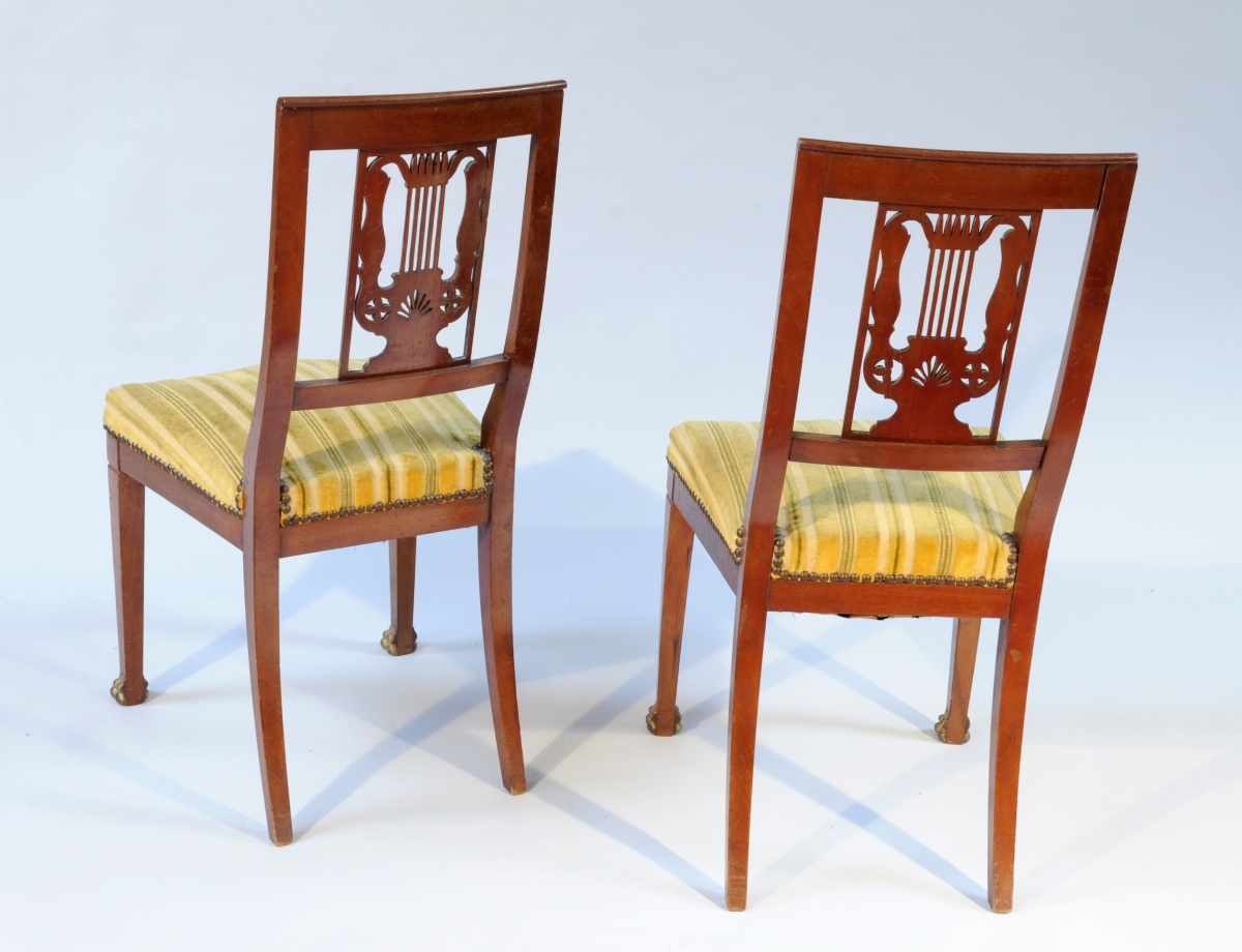 Paire de CHAISES en noyer teinté à la façon de l'acajou, le dossier ajouré d'une lyre rehaussée à l'or. Pieds antérieurs à griffes de lion en bois doré, pieds postérieurs sabre.