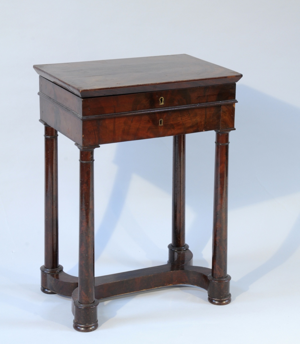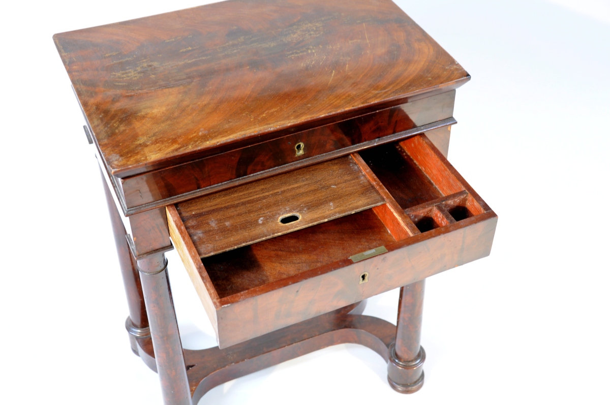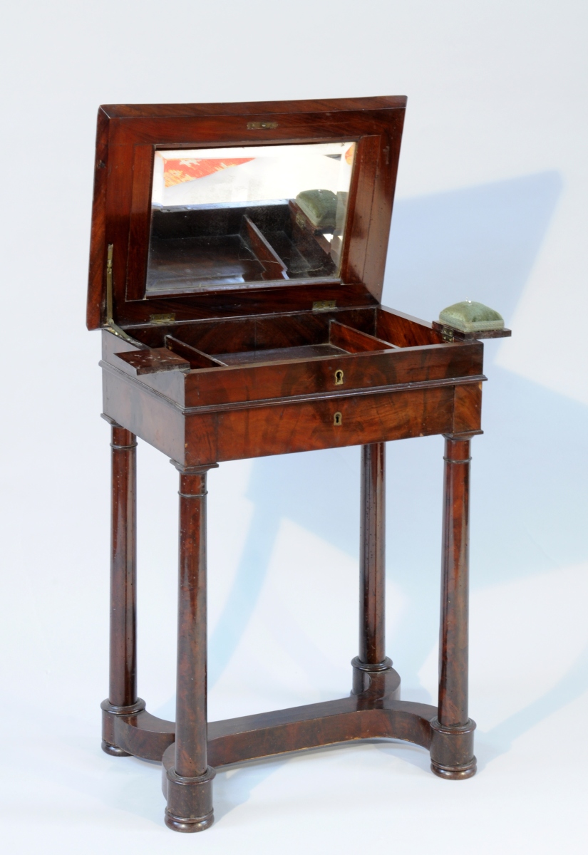 TABLE À OUVRAGE en placage d'acajou reposant sur quatre pieds colonnes réunis par une entretoise en X. Elle ouvre par un tiroir en ceinture découvrant une écritoire. L'abattant foncé d'un miroir ouvre sur un coffre compartimenté.