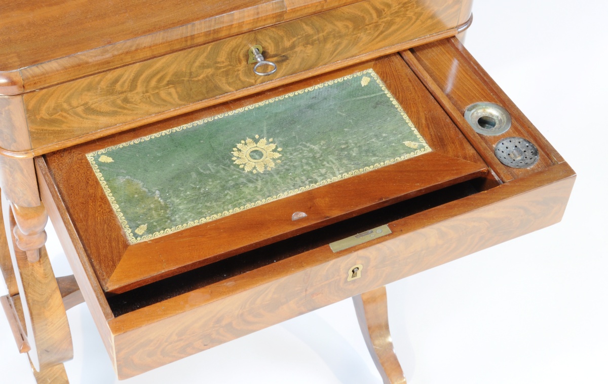 TABLE À OUVRAGE en acajou flamé et placage d'acajou reposant sur des piètement lyre à col de cygne réunis par une traverse. Elle ouvre par un tiroir en ceinture découvrant une écritoire. L'abattant foncé d'un miroir ouvre sur un coffre compartimenté.