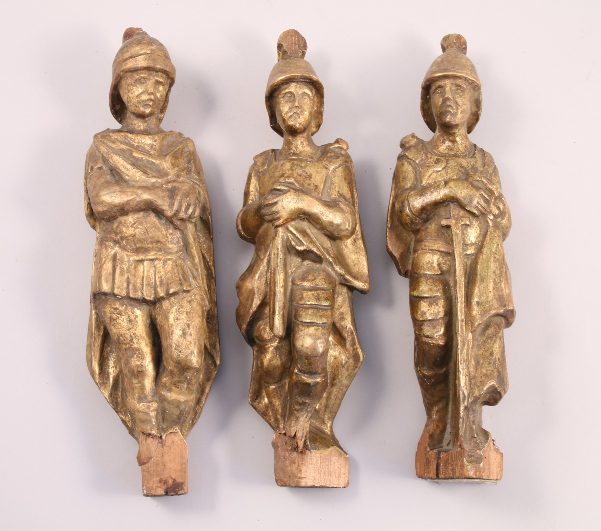 TROIS STATUETTES en bois sculpté stuqué et doré, provenant d'un ensemble, figurant des légionnaires romains.