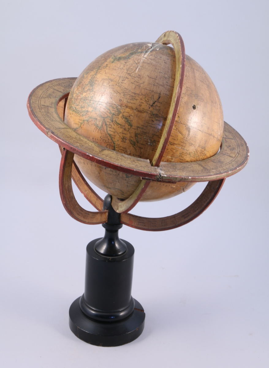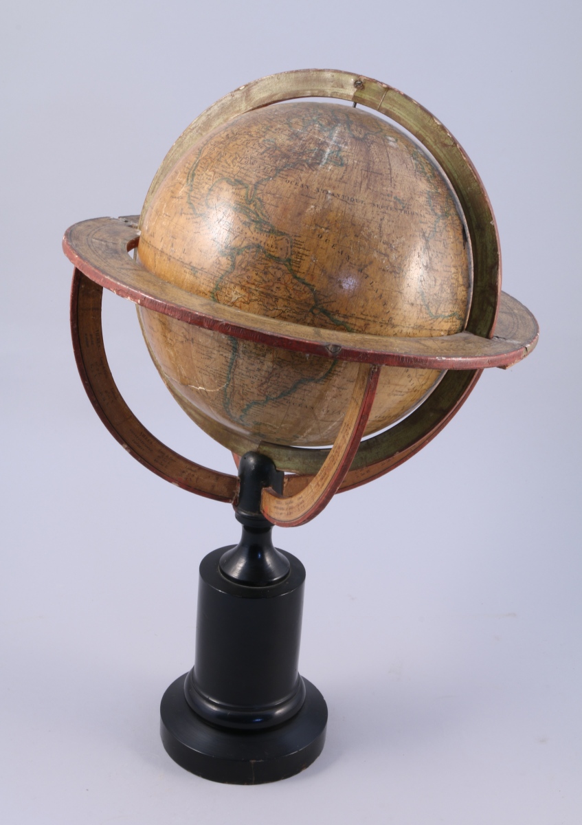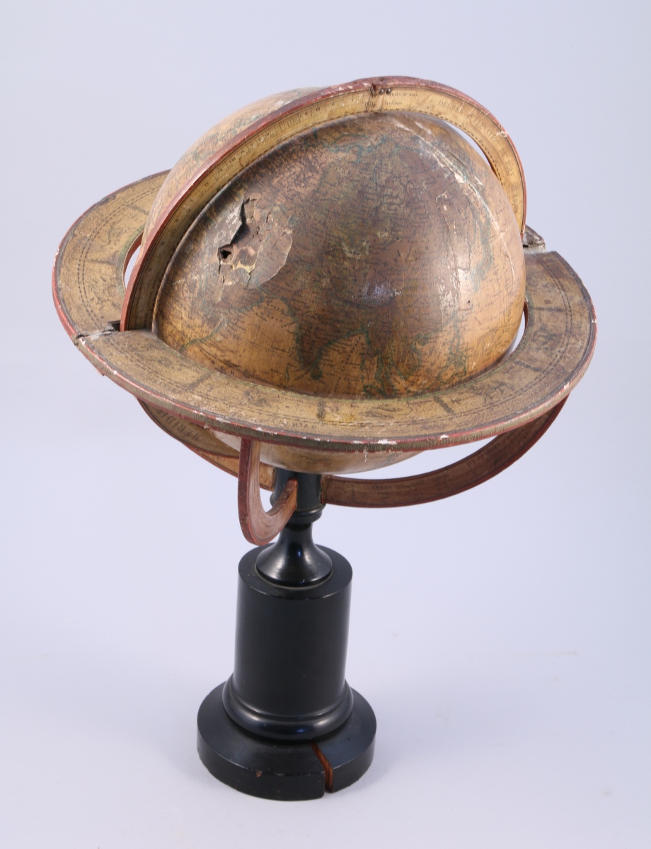 GLOBE TERRESTRE en carton et papier polychrome de la Maison Delamarche à Paris. La table équatoriale supportée par quatre armilles en carton et papier indiquant des longitudes et latitudes des villes principales. Cercle méridien. Repose sur un socle en base de colonne en bois tourné et noirci.