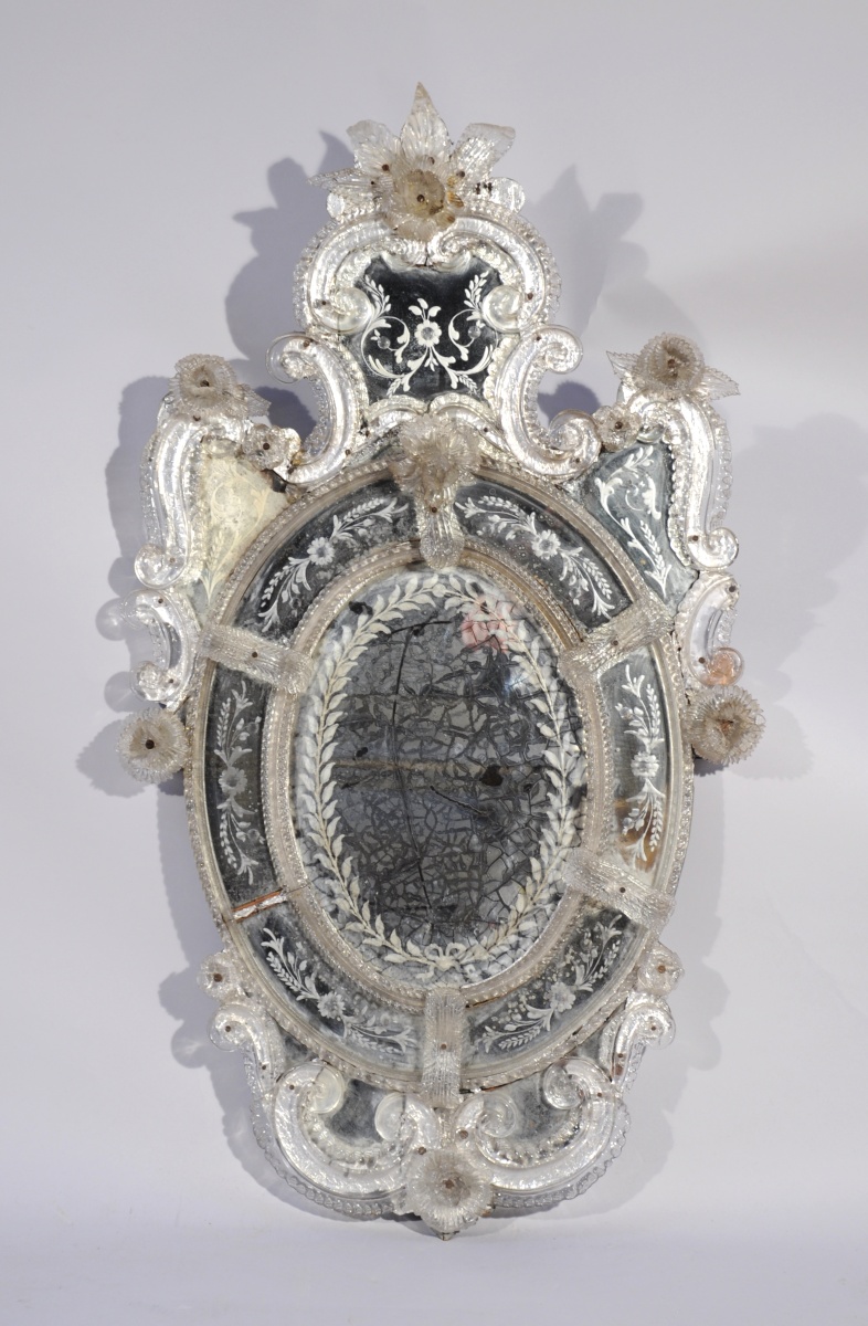 MIROIR À PARECLOSES dit "de Venise" de forme chantournée en verre. La partie centrale de forme ovale agrémentée d'un fronton, d'épaulements et d'un culot à décor d'éléments appliqués figurant fleurs, feuillages et agrafes. Les miroirs gravés de rinceaux fleuris.