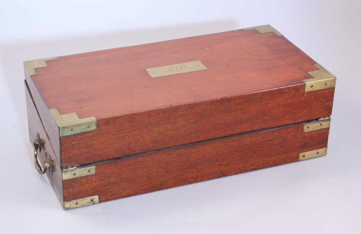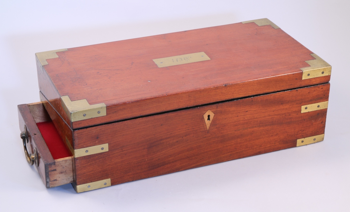 ÉCRITOIRE DE VOYAGE dite "de marine" de forme rectangulaire en acajou ouvrant pas un tiroir sur le côté. Écoinçon et renforts en laiton. Le centre du couvercle incrusté d'une plaque de laiton de forme rectangulaire monogrammée "SJW". Mains tombantes latérales. L'intérieur en bois noirci à deux abatants gaînés de cuir rouge découvrant deux niches. La partie supérieure à cinq compartiments. Étiquette de fabricant "T. Handford".