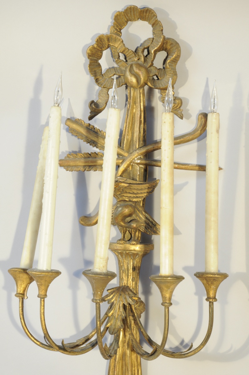DEUX PAIRES D'APPLIQUES à deux bras de lumière formant SUITE en bois sculpté, stuqué et doré. Elles adoptent la forme de deux pièces d'étoffe retenues par un ruban noué et terminées par un gland. La partie centrale est ornée d'un aigle en ronde-bosse, arc et flèches, reposant sur une console feuillagée. Les bras de lumière à armature métallique agrémentée d'un fleuron pour une paire et d'un disque pour l'autre naissent de trois feuilles en tôle emboutie pour le premier modèle.