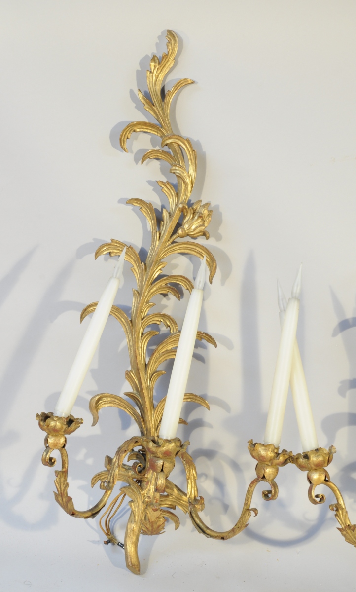 SUITE DE QUATRE APPLIQUES à deux bras lumières en bois sculpté, stuqué et doré. Elles adoptent la forme d'une palme mouvementée. Les bras de lumière en métal à enroulements appliqués d'acanthe en tôle emboutie. Le bobèches figurant une fleur épanouie.