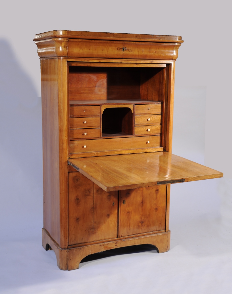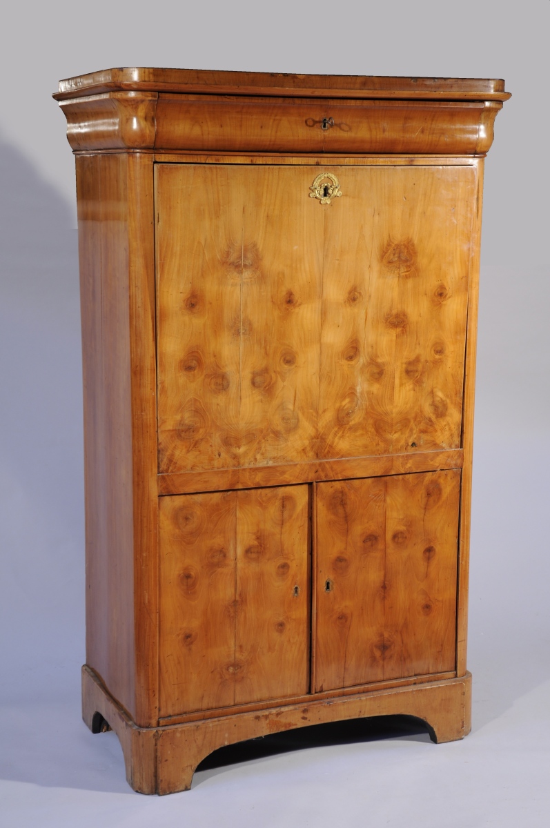 SECRÉTAIRE À ABATTANT en placage de bois clair à noeuds ouvrant par un tiroir en doucine à l'entablement et deux vantaux en partie basse. L'abattant découvre une niche encadrée de six petits tiroirs et d'un grand. Boutons de tirage en os tourné (manques). Entrée de serrure en bronze ciselé et doré a décor de cornes d'abondance, palmes, rinceaux et fleurons.