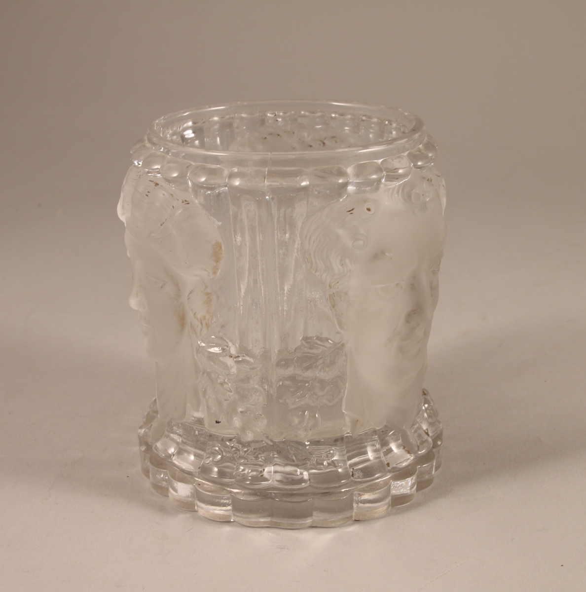 POT de forme tronconique en verre moulé et pressé à décor de godrons et de trois visages, l'un féminin, les deux autres masculins.