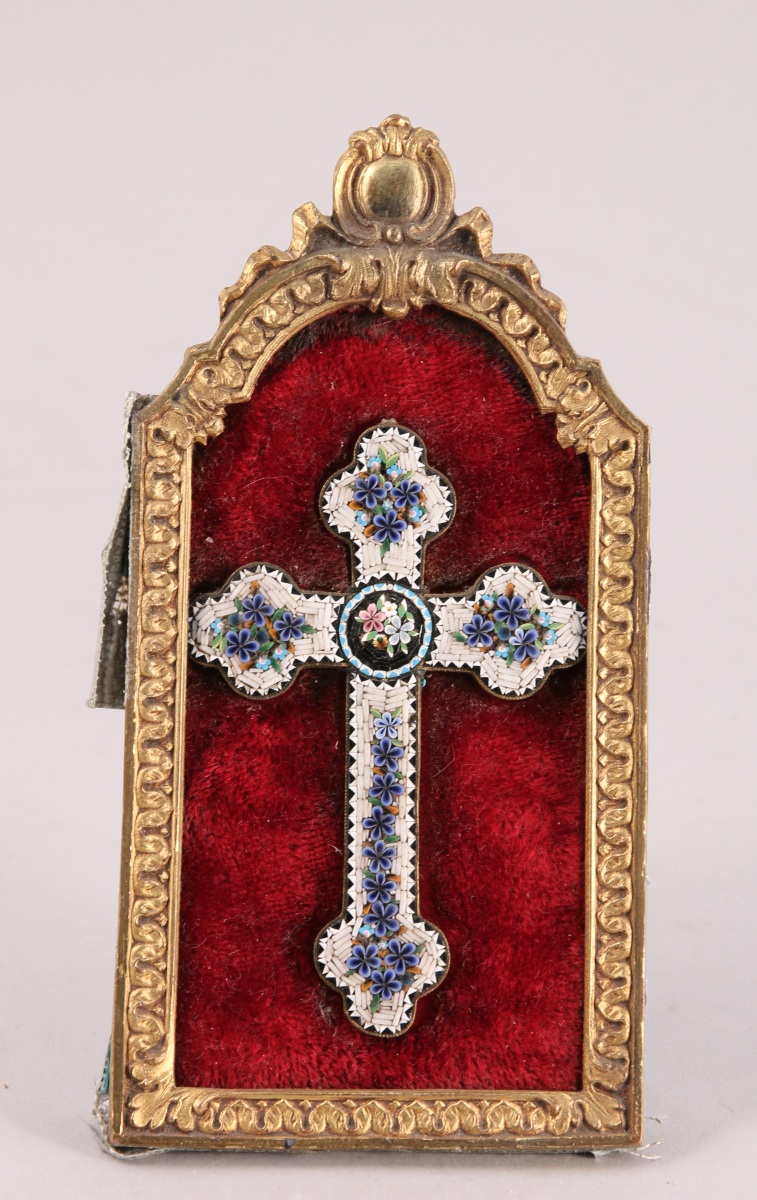 CROIX en micromosaïque de pâte de verre à motifs d'amétistes et fleurs, sur un fonds de velours cramoisi, dans un entourage de métal doré orné de fleurs de lotus.