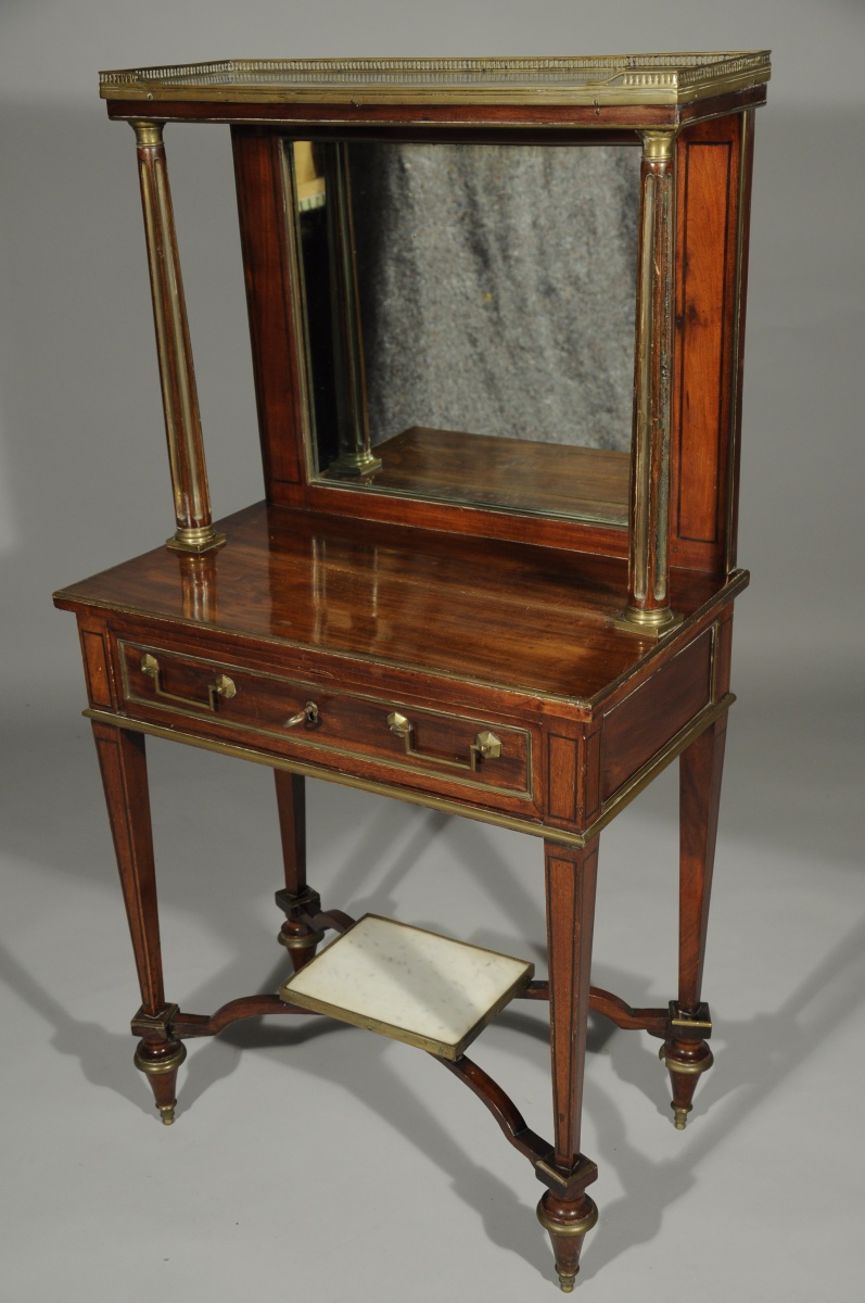 BONHEUR DU JOUR à fond de glace en acajou et placage d'acajou. Il ouvre en façade par un tiroir en ceinture découvrant une écritoire. Dessus de marbre blanc serti d'une galerie de bronze ajouré soutenu par deux colonnes à cannelures garnies de laiton. Repose sur quatre pieds gaine terminés par une toupie et réunis par une entretoise en X centrée d'une tablette foncée de marbre blanc.