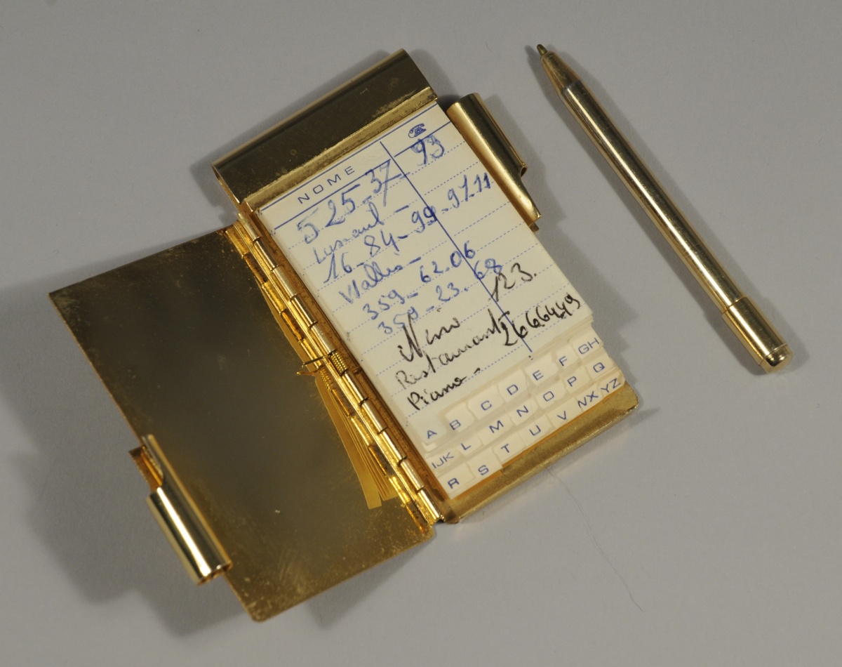 RÉPERTOIRE rectangulaire en métail doré, orné d'un chat sertis de pierreries et perles sur le premier plat. Fermeture par charnière rentenue par un stylographe.
