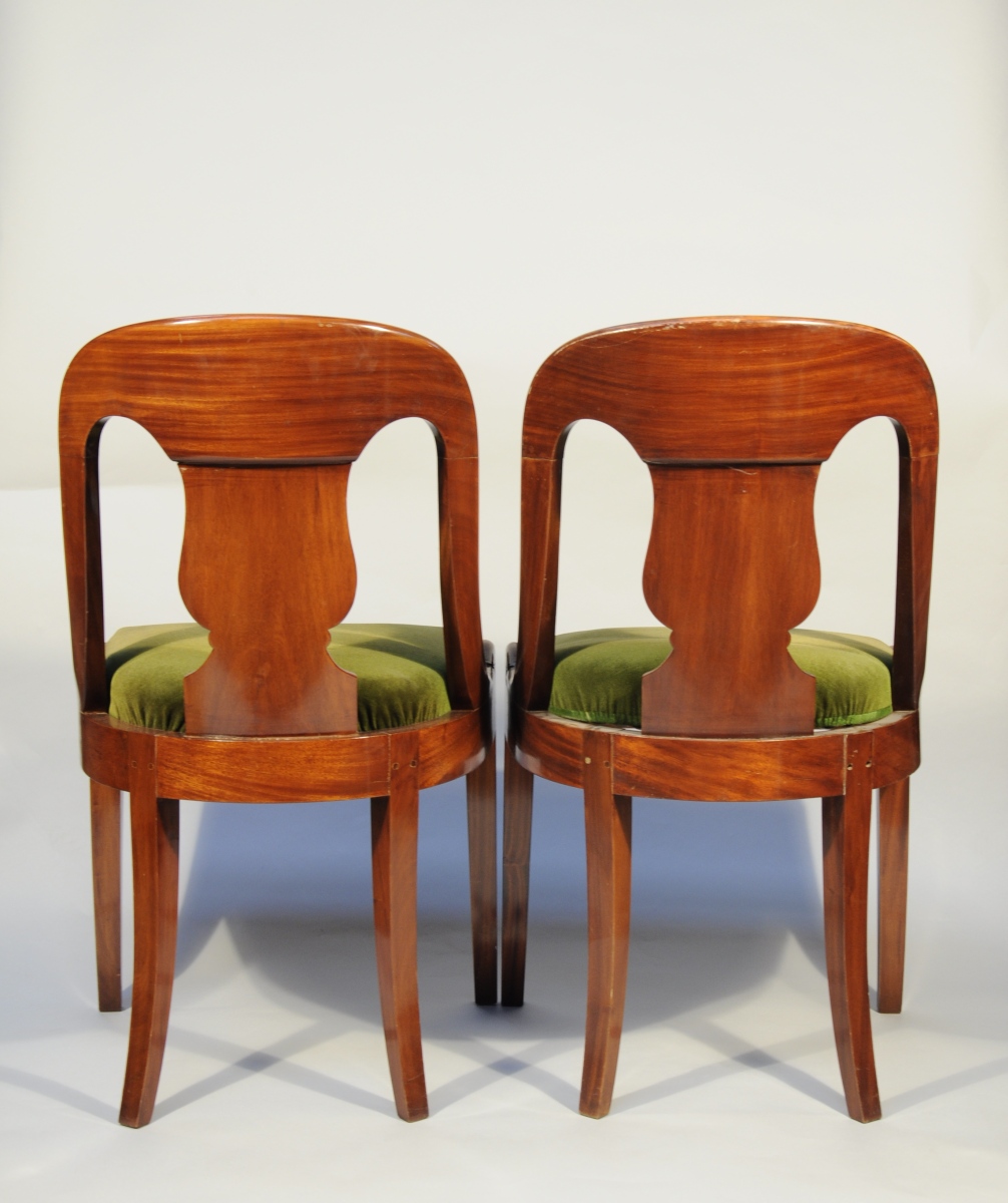 Paire de CHAISES GONDOLES en noyer teinté acajou. Reposent sur quatre pieds sabres.