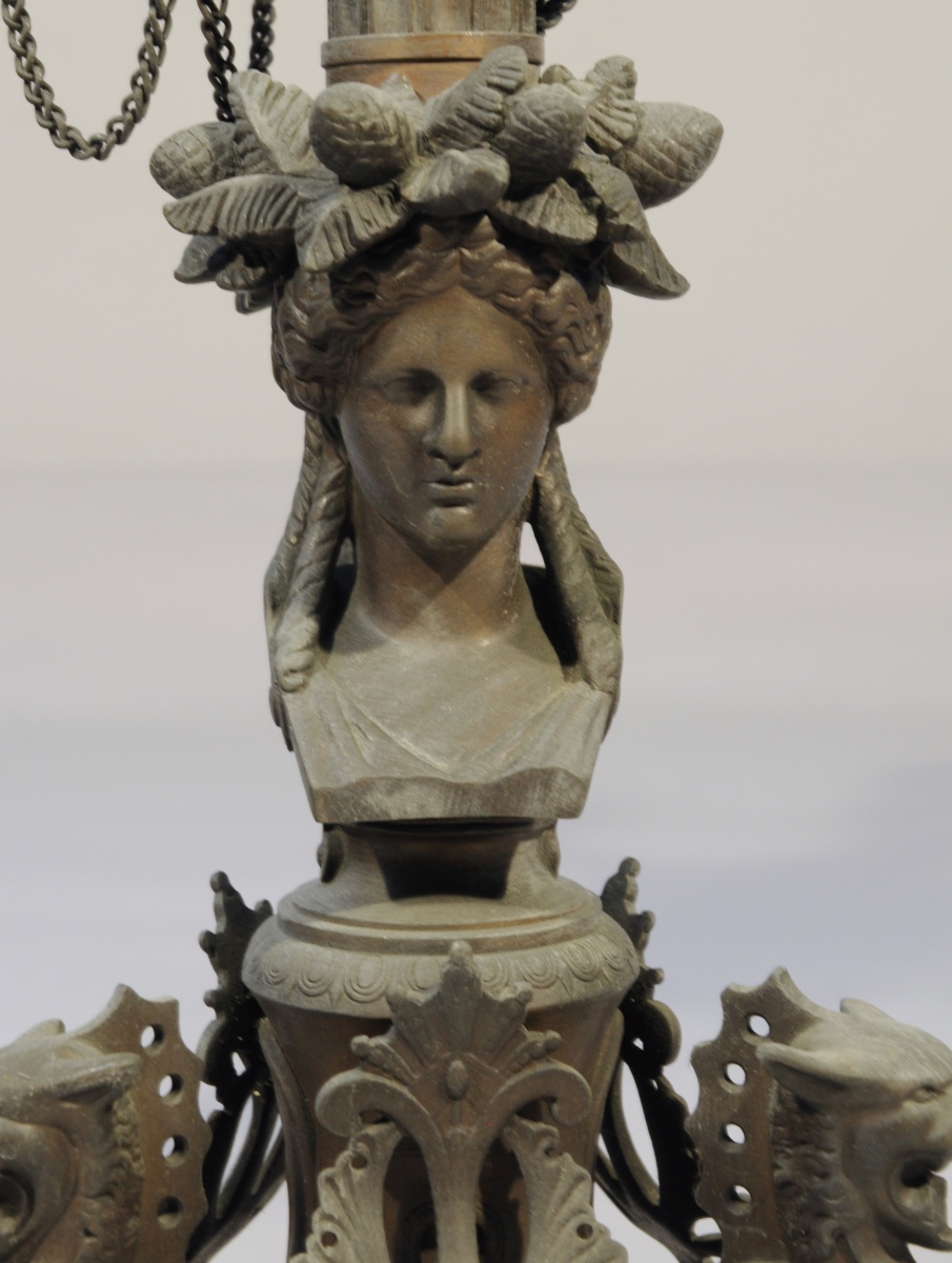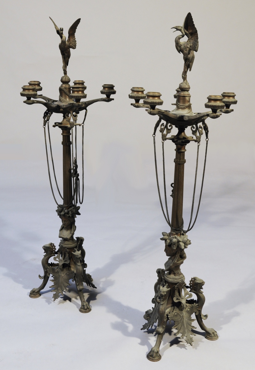 PAIRE DE CANDÉLABRES en bronze patiné à cinq bras de lumière. Fût cannelé à chainettes reposant sur un buste de femme en hermès. Base tripode à griffes de lions, têtes de griffons et palmettes. Une grue sur un socle à la partie supérieure.