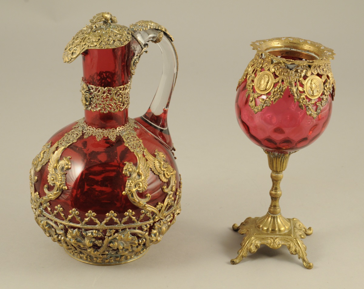VERSEUSE et VERRE BALLON en verre rouge dans des montures richement ciselées en métal doré, figurant griffons, putti phytomorphe, acanthes, masque, lions, médailles, guirlandes de fleurs.