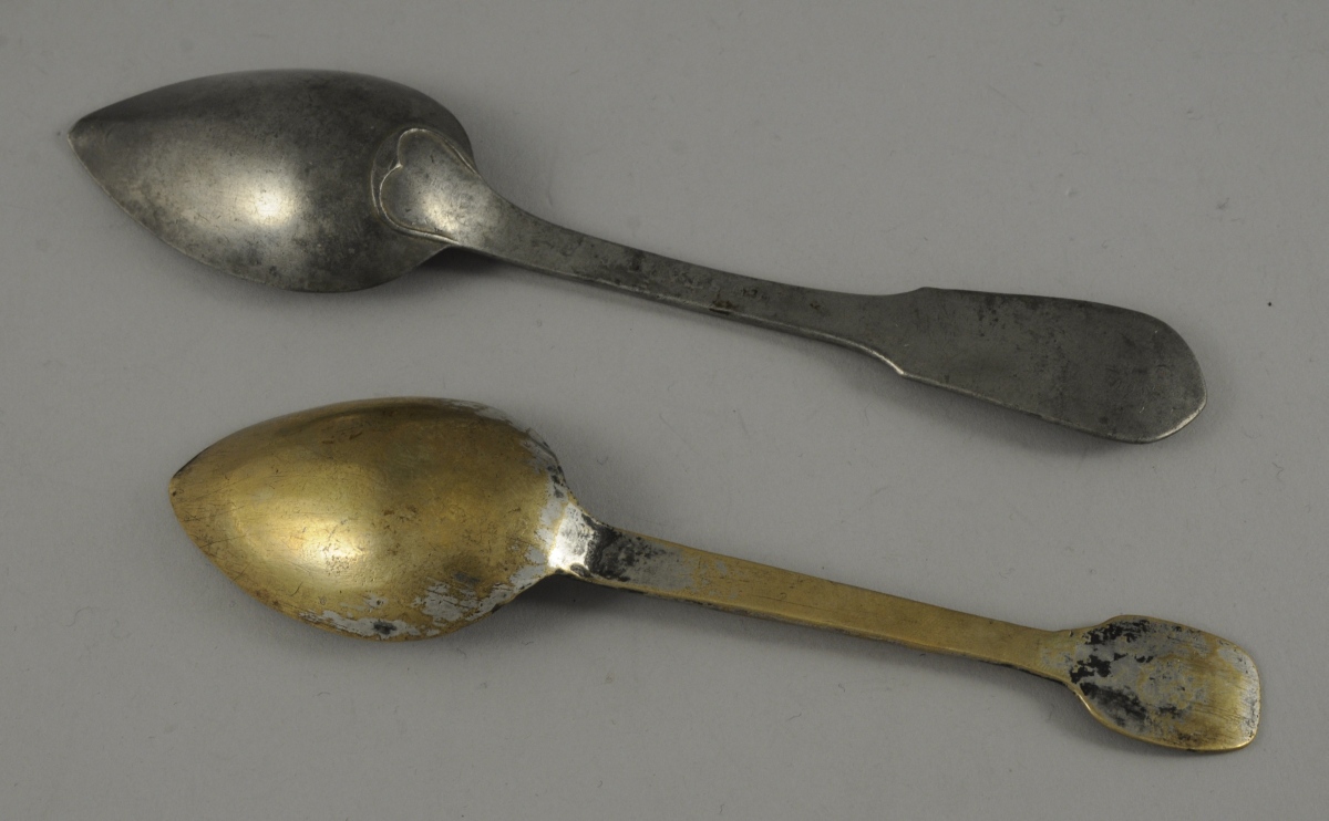 - La première en laiton étamé. Elle possède un large cuilleron. Le manche terminé par une spatule marquée "ROULE" dans un cercle centré d'une étoile. Travail ancien, Normandie? Long. 18,3 cm. (manque à l'étain)