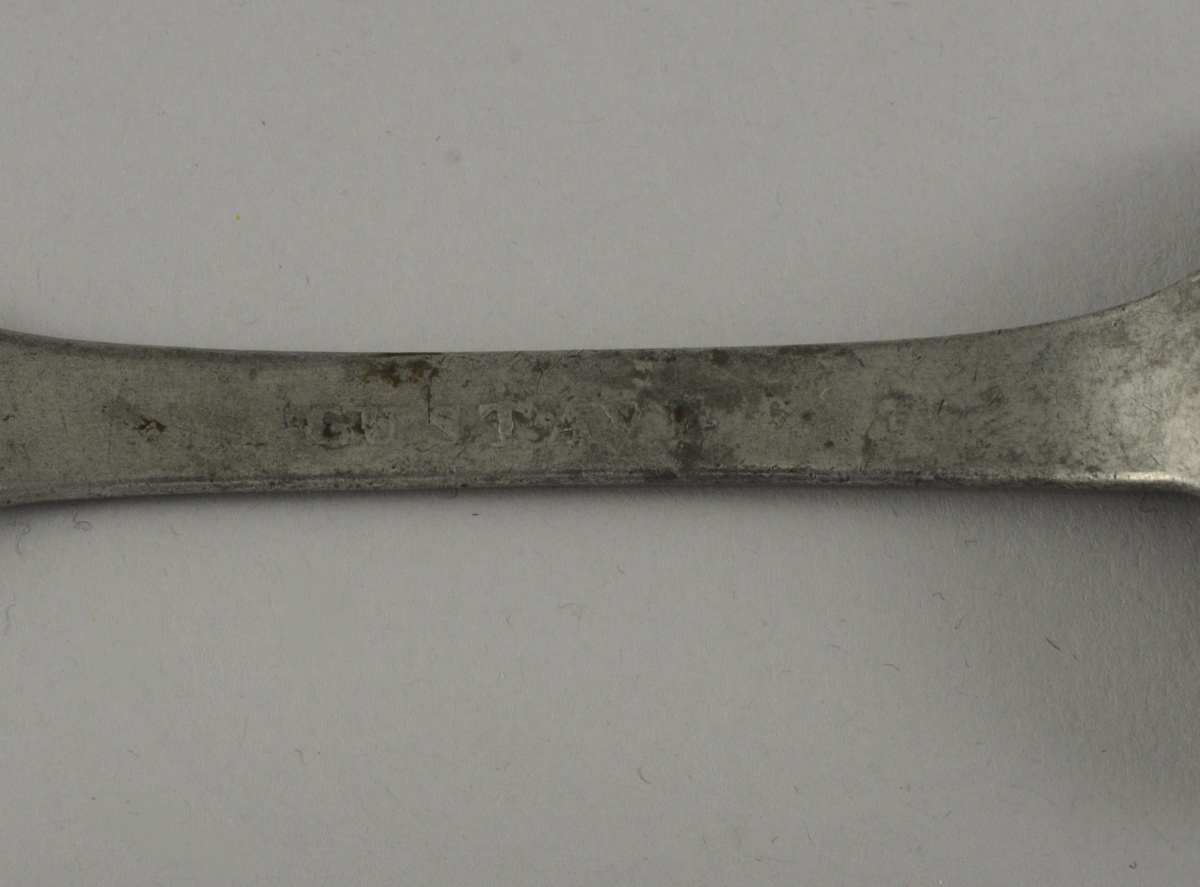 - La seconde en étain. Modèle uniplat. Le manche marqué "GUSTAVE". Travail ancien. Long. 21 cm. (oxydations)