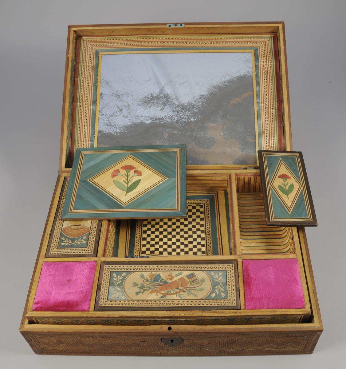 BOÎTE À OUVRAGES en marqueterie de paille. Le couvercle, foncé à l'intérieur d'un miroir, découvre un intérieur séparé, en partie inférieure, en deux compartiments, et comportant, en partie supérieure, un casier amovible. Ce dernier comporte deux coussins de brodeuse et quatre compartiments. Sur le couvercle, protégé par une vitre, scène de port agrémentée d'un château et de bateaux sur lesquels flotte le drapeau tricolore, et animée d'un jeune couple se tenant par le bras. L'ensemble est encadré de tiges entrelacées et de fleurs. À l'intérieur, décor d'un trophée de musique, de vases fleuris et des attributs de l'amour: carquois de flèches, flambeau et deux curs transpercés par la même flèche. Côtés marquetés de chevrons. Entrée de serrure en forme d'écusson.