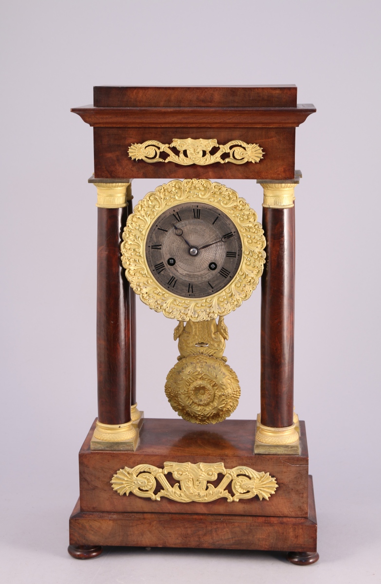 PENDULE PORTIQUE À COLONNES en placage d'acajou. L'entablement à doucine retenu par quatre colonnes d'ordre dorique enserrant le mouvement. Base en plinthe reposant sur quatre pieds en boule aplatie. Garniture de bronzes ciselés et dorés tels que applications sur la base et l'entablement à décor ajouré de dauphins et palmettes, chapiteaux et bases des colonnes à frises de feuilles d'eau et tores de lauriers. Cadran en métal argenté indiquant les heures en chiffres romains serti d'une frise de feuillages stylisés. Balancier à riche décor de fleurs et feuillages sommés de deux cygnes adossés.