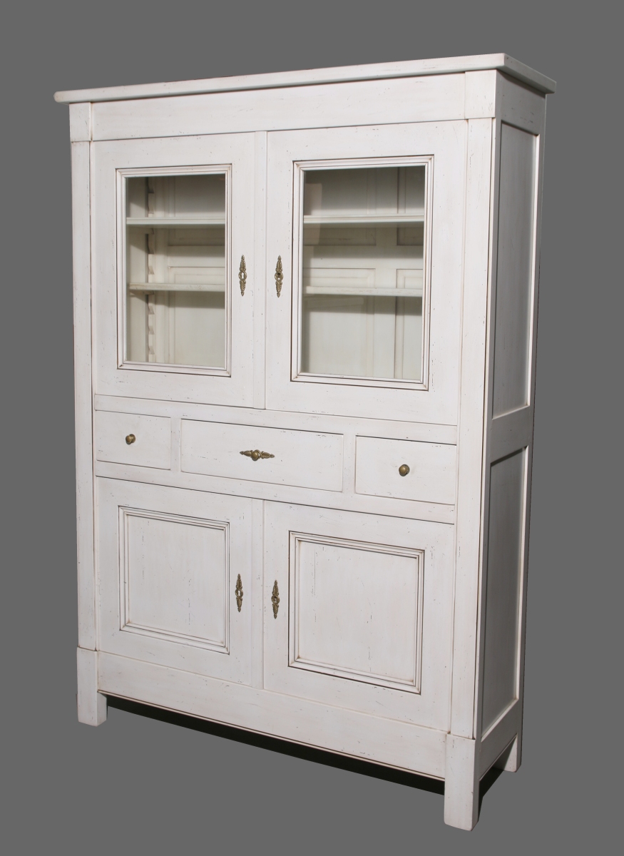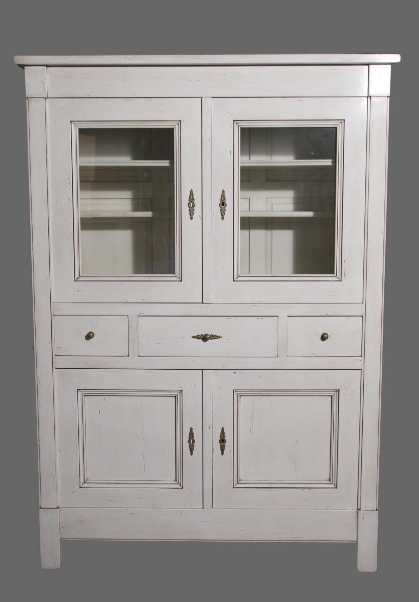 BUFFET de forme rectangulaire en bois mouluré et laqué blanc ouvrant en façade par quatre portes dont deux vitrées en partie supérieure et deux tiroirs en ceinture. Il repose sur quatre pieds droits.
