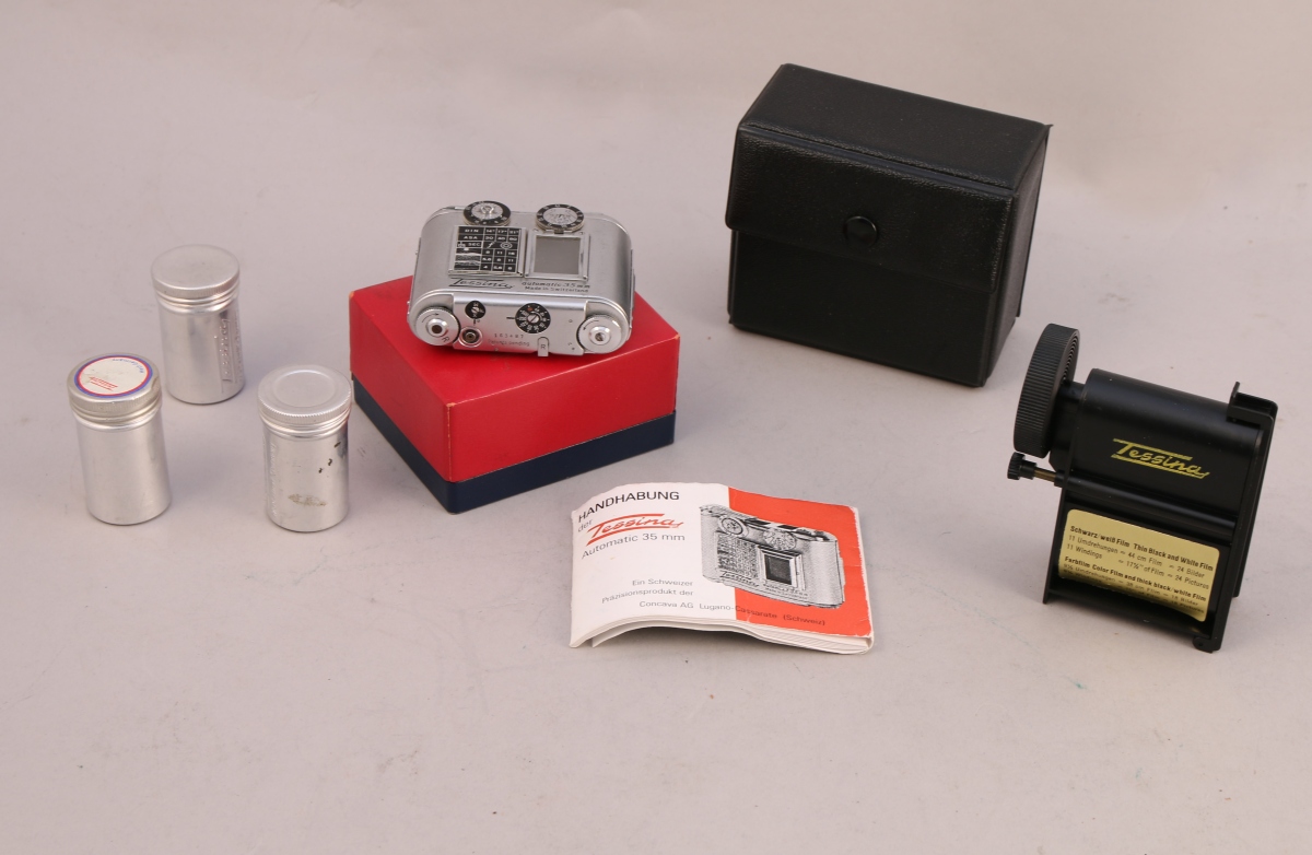 Tessina Automatic No 163487 avec objectif 35-25 mm/2,8, avec sa boite d’origine, sacoche, notice et accessoires.