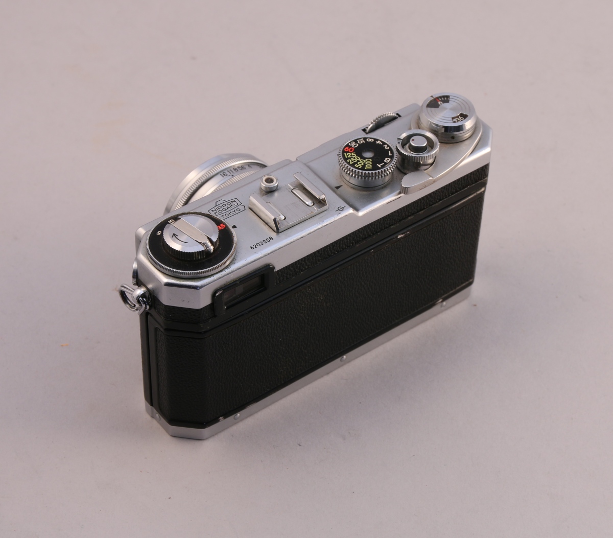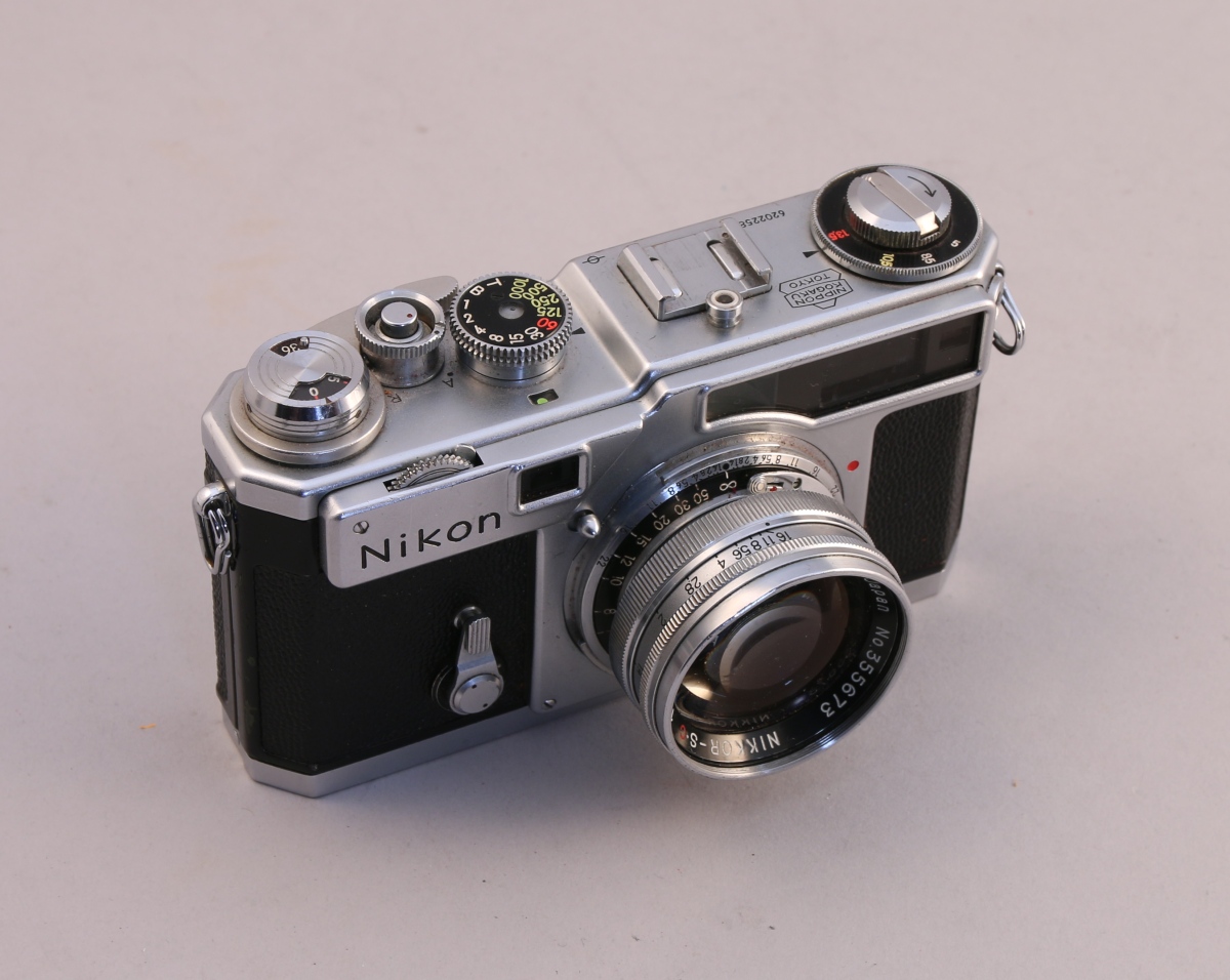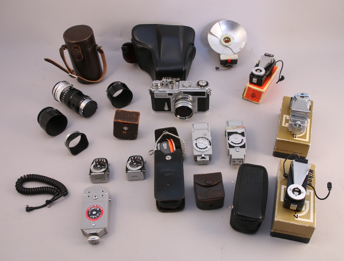 Nikon Nippon Kogaku Tokyo No 6202258 avec objectif Nikkor-S 1:1.4 f = 5 cm et pare soleil. Objectif Nikkor-Q pour Nippon Kogaku 1:35 f = 13,5 cm No 277475 avec capuchon et étui. Divers accessoires Nikkon dont 3 flashes et deux pare-soleil.