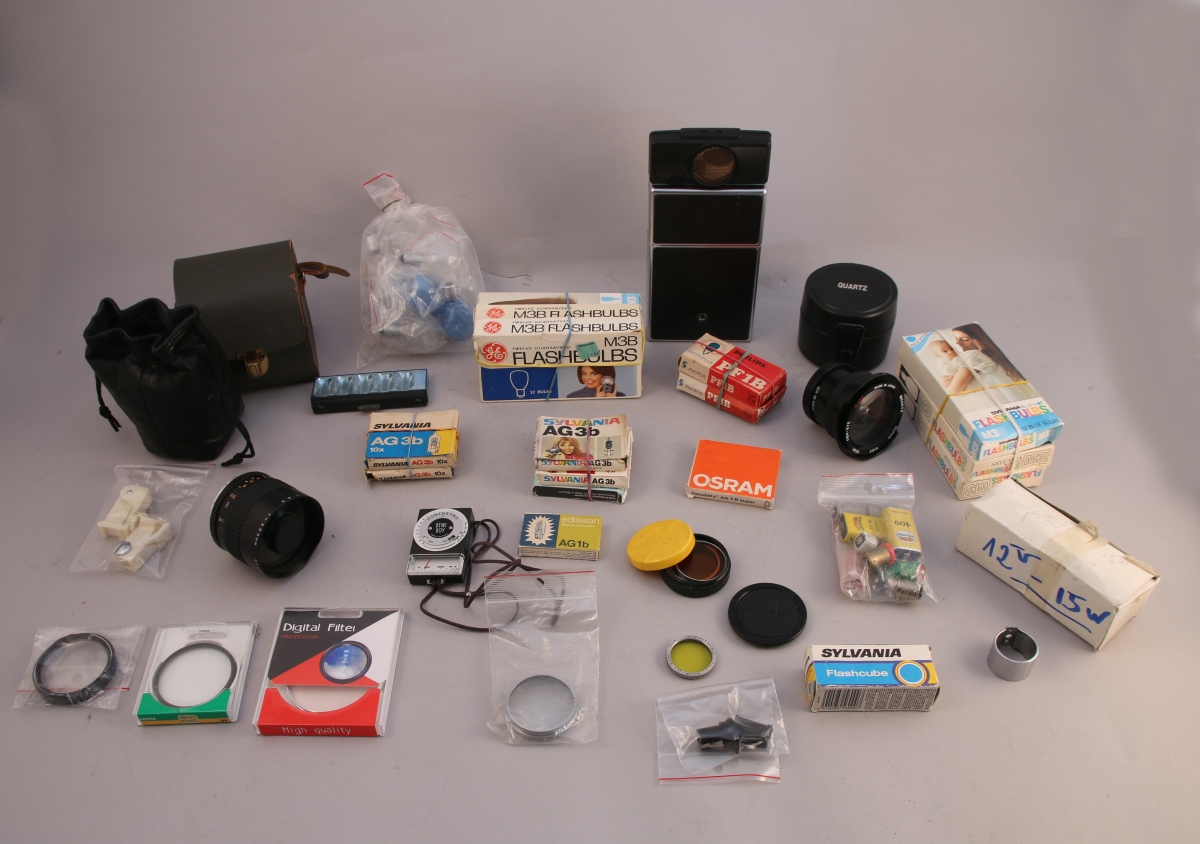 POLAROÏD Modèle 5X-70 Land Camera Sonar Auto Focus. Objectif Reflex Makinon MC (choqué à la base), objectif quartz dans son étui, accessoires divers, lampes de flashes dont certaines dans leurs boites dorigine, cellule Bewi Boy.