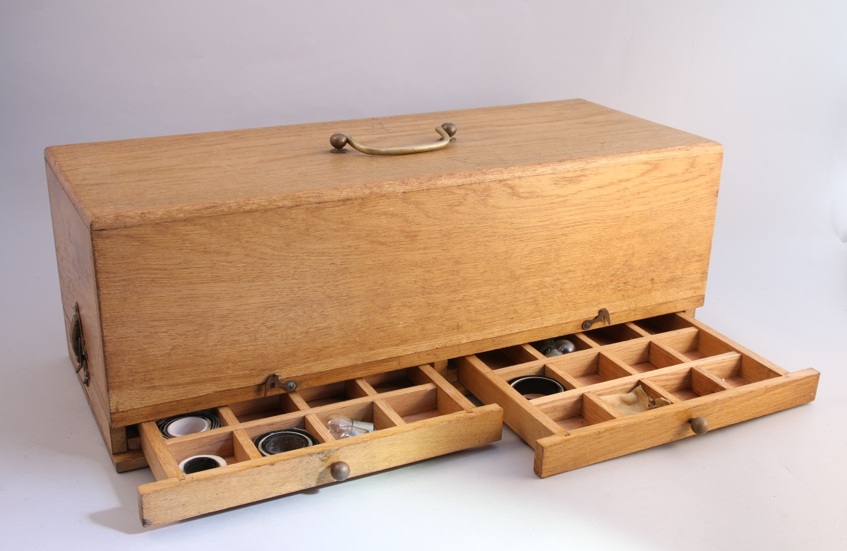 Appareil à monter les films ALMO 2055 No 407445 dans sa malette en chêne, avec poignée et tiroirs à accessoires pour films et ampoules.