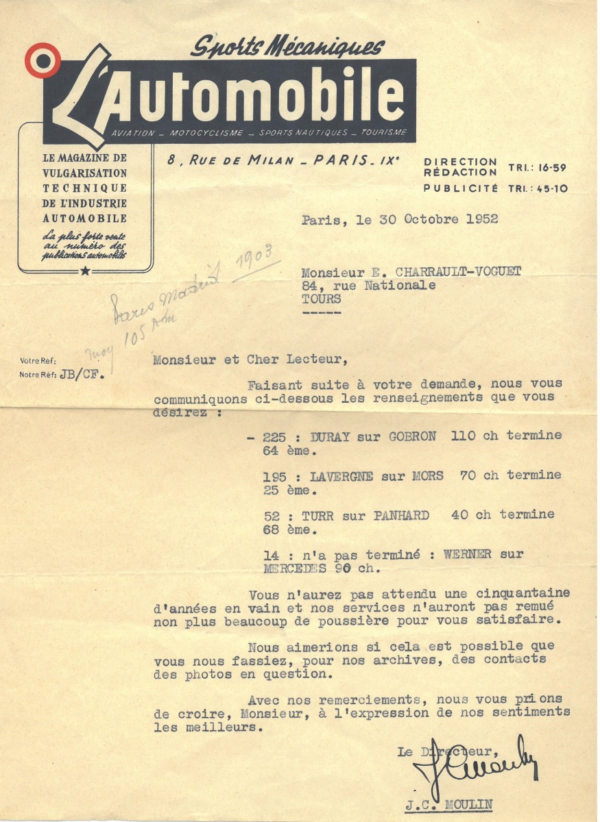 JOINT: Courier de JC Moulin, directeur de l'Automobile daté du 30 octobre 1952, précisant l'identité des équipages.