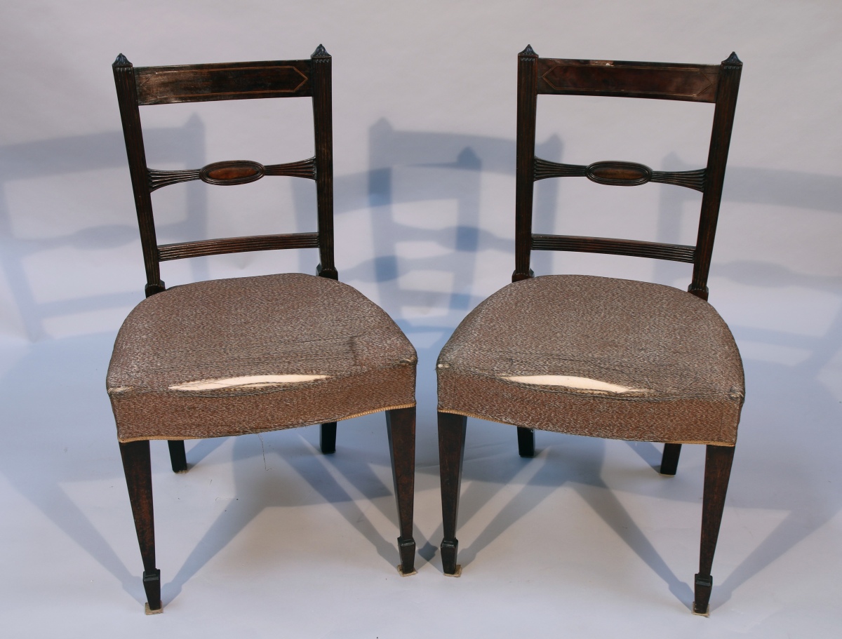 en bois teinté à la façon de l'acajou et placage d'acajou. Dossier de forme trapézoïdale à montants et traverses godronnés. La traverse supérieure incrustée de filets de bois clair. Elles reposent sur quatre pieds, les antérieurs en gaine, les postérieurs en sabre.