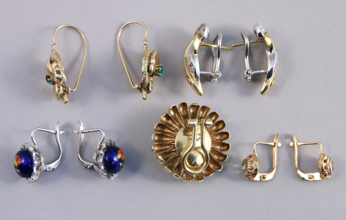 RÉUNION de QUATRE PAIRES DE BOUCLES D'OREILLE en or jaune et gris 18K: trois serties de pierres blanches ou vertes et une émaillée.