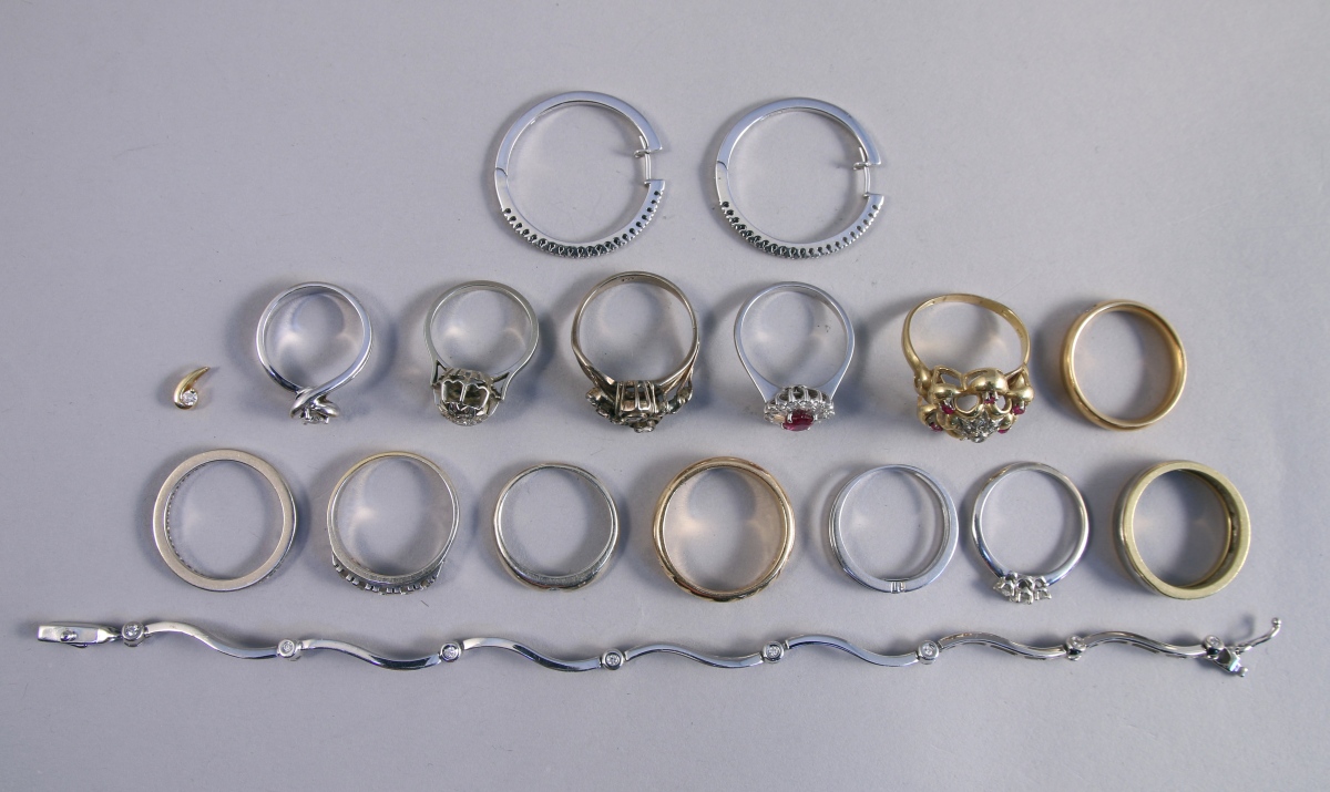 RÉUNION de 16 BIJOUX en or gris ou jaune 18K sertis de petits DIAMANTS: 9 bagues, 4 alliances, une paire d'anneaux d'oreille, un petit pendentif et un bracelet.
