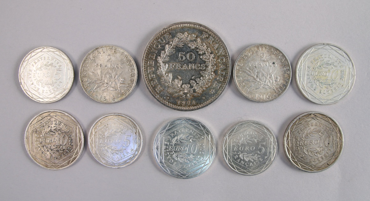 10 MONNAIES argent: 50 F Hercule (1974), deux 2 F semeuse (1916), quatre 10 (Midi-Pyrénées 2010, Nord-Pas-de-Calis 2010, Île-de-France 2012 et Semeuse 2009) et trois 5 (Semeuse 2008, Fraternité 2013 et Liberté 2013).