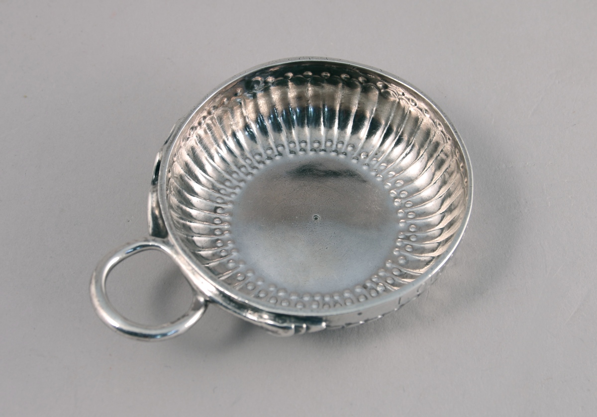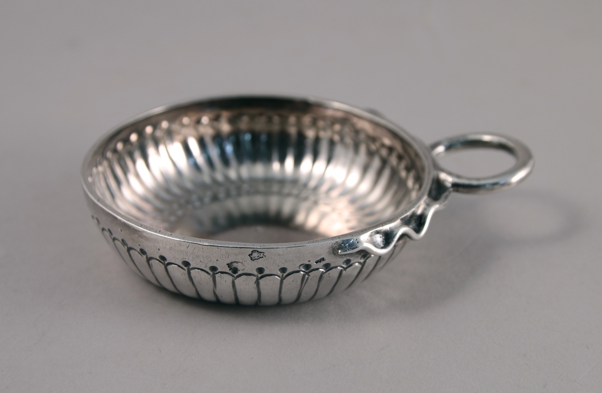 PARIS. TASTEVIN en argent orné de godrons et de perles. Anse serpentiforme. Marqué "LOUIS BENARD". Poinçons aux Fermiers généraux de la Juridiction de Paris. Décharge: 1750-1756. Contremarque au soulier et recense de 1798.