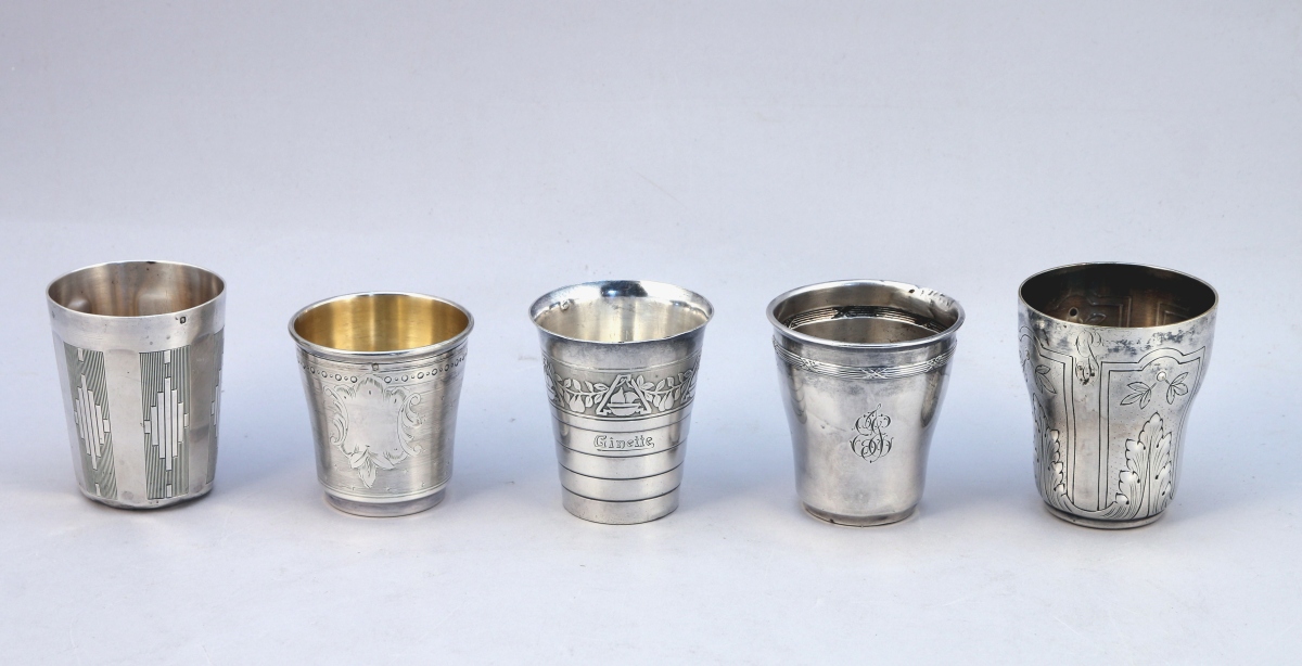 CINQ TIMBALES GOBELET en argent, à motifs fleuris, de frises, art déco ou monogrammée.
