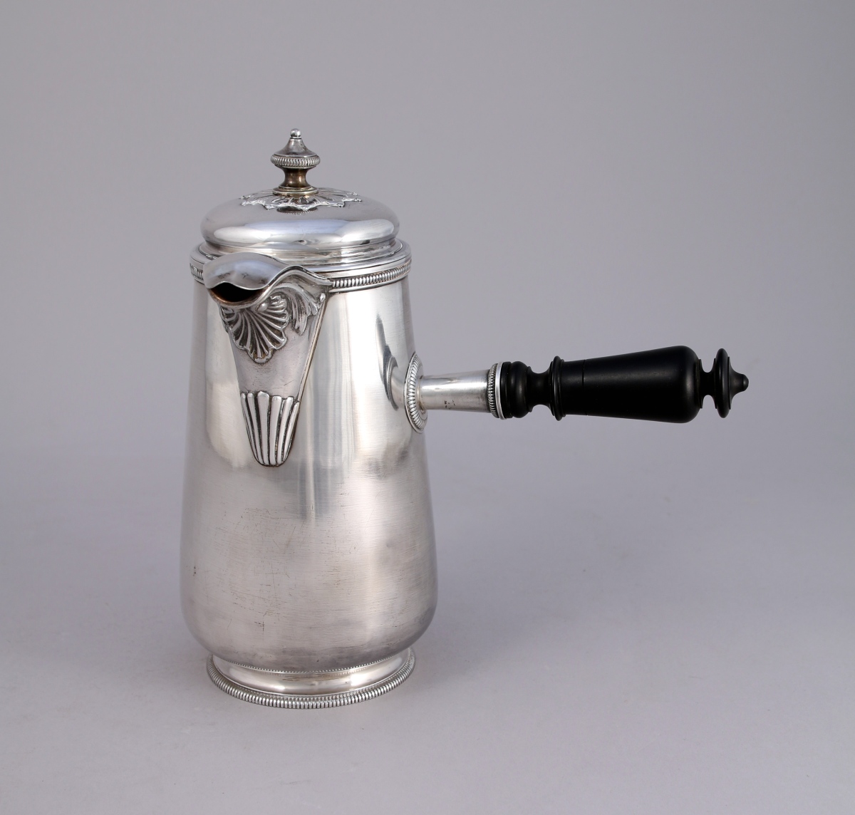 CHOCOLATIÈRE de forme tronconique en argent à décor de frises de godrons. Le corps monogrammé "AD". Bec verseur à décor d'une large coquille, agrafes feuillagées et godrons. L'orifice supérieur masqué par une toupie pivotante sur une terrasse fleuronnée. Manche latéral en ébène tourné. Elle repose sur un piédouche orné d'une frise de godrons.