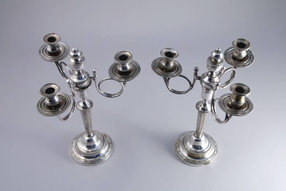 PAIRE de FLAMBEAUX formant CANDÉLABRES à trois bras de lumière en métal argenté. Les bras adoptent la forme d'une trompe de chasse. Le pavillon formant bobèche reçoit le binet à décor de rais de perles. Un pot couvert à l'amortissement. Fût fuselé, facetté et cannelé reposant sur une base circulaire.