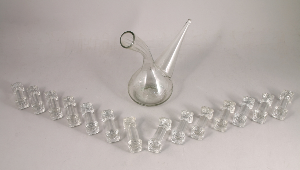 Suite de 14 REPOSE-COUTEAUX en verre pressé-moulé. Ils adopte la forme d'une colonne godronnée à deux chapiteaux stylisés.