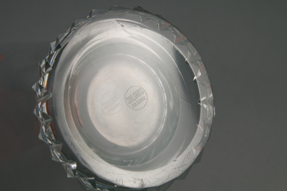 SAINT-LOUIS. Partie de SERVICE DE VERRES, 80 pièces, en cristal. Corps de forme tronconique reposant sur un pied circulaire à double frise de pointes de diamant. Il se compose de huit verres à eau, 15 verres à vin (dont quatre légèrement plus petits), 26 verres à porto, 15 coupes à champagne, 13 verres à liqueur, une carafe, un broc et un vase.