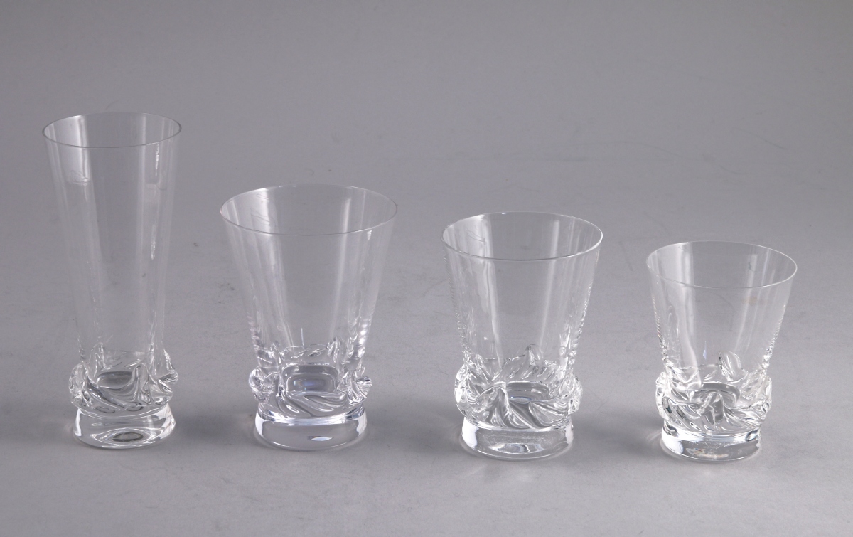 DAUM. SERVICE de VERRES en cristal taillé, modèle SORCY, 32 pièces, la base à décor moulé de vaguelettes. Il se compose de 8 flûtes à champagne, 8 verres à eau, 8 verres à vin rouge et 8 verres à vin blanc. Signés. Dans trois boîtes d'origine.