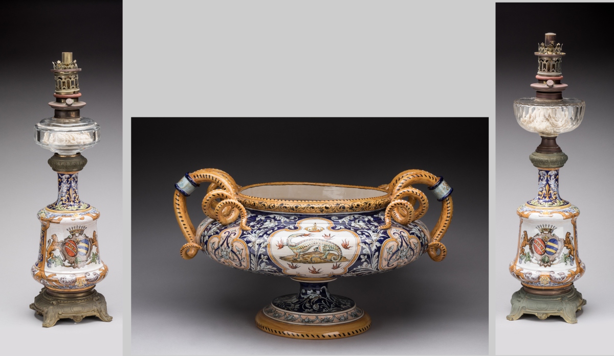 en faïence polychrome sur fond bleu à motifs de rinceaux feuillagés. Elle se compose d'une vasque et d'une paire de lampes à pétrole.