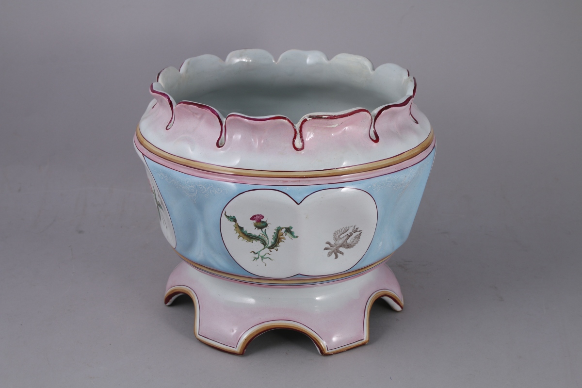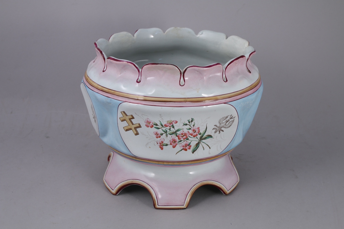 SAINT CLÉMENT. KELLER et GUÉRIN. JARDINIÈRE circulaire à col évasé et mouvementé en faïence polychrome, à décor de symboles lorrains tels que chardons, croix de lorraine, alerions et fleurs dans des cartouches. Elle repose sur six petits pieds en arcades. Marqué au revers "SCT K.G".
