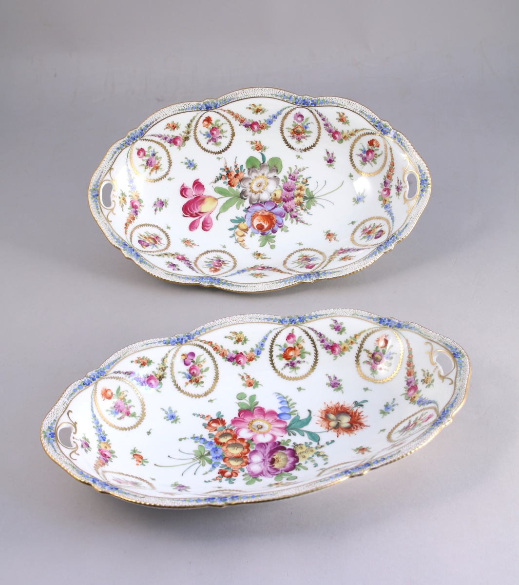 DRESDE. Paire de BANETTES de forme oblongue à bords chantournés en porcelaine à riche décor polychrome et or de bouquets de fleurs au naturel. Le marli présente une frise figurant, en alternance, des bouquets inscrits dans des couronnes de lauriers, et des guirlandes florales. Petites anses ajourées. Marque au D couronné et marque en creux.