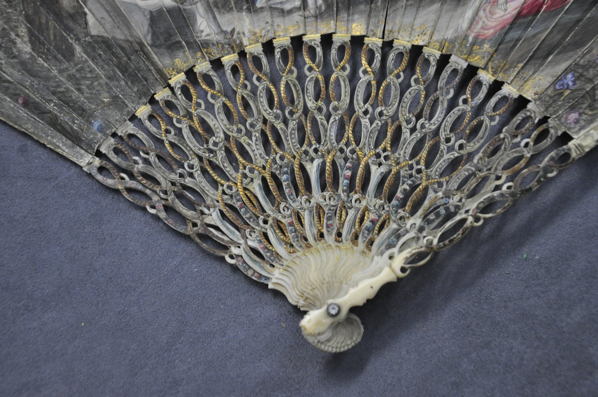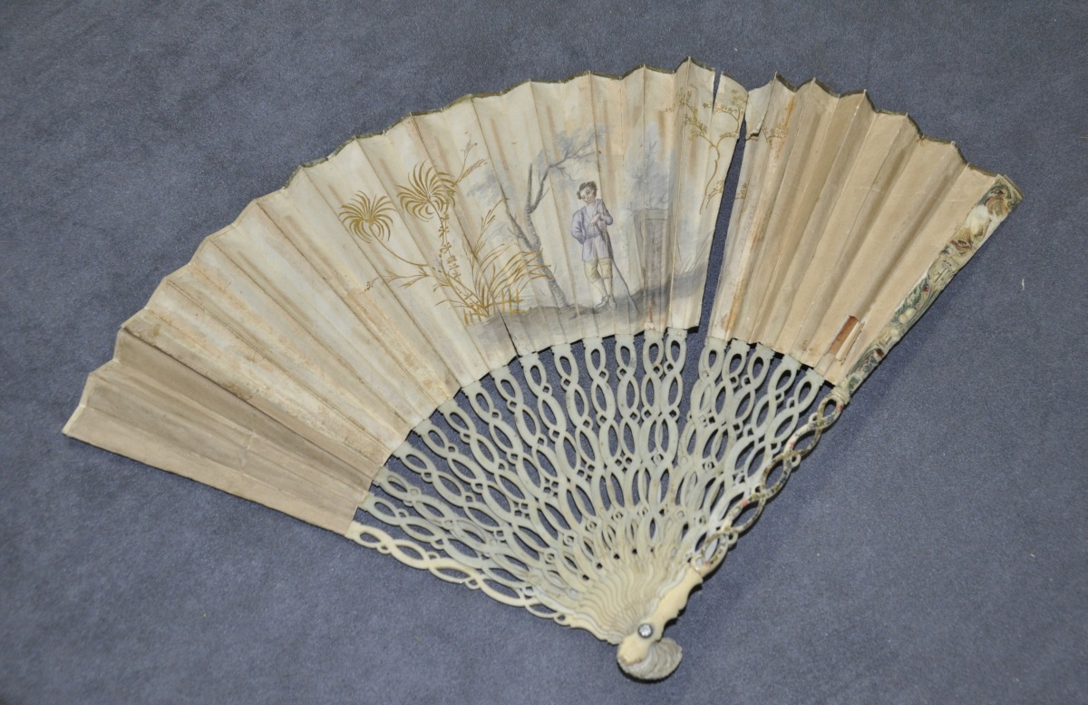ÉVENTAIL en ivoire (elephantidae SPP) sculpté polychrome, 22 brins, la feuille ornée d'une gouache avec rehauts de mica d'une scène champêtre.