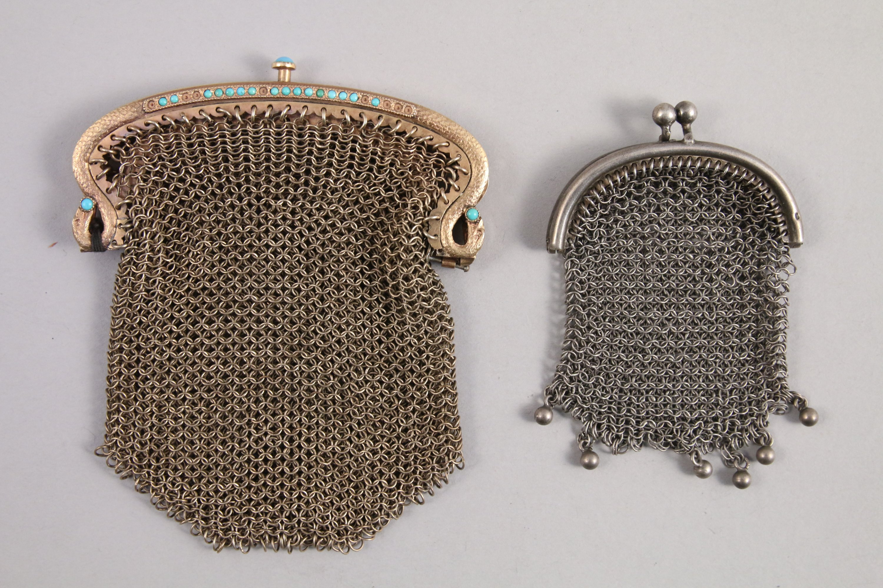 JOINT: PORTE-LOUIS en argent à maille et fermoir Poids. 20,9 g. PORTE-MONNAIE en métal doré à maille et fermoir à décor de cabochons de turquoise et chimères (manques et accident au fermoir).