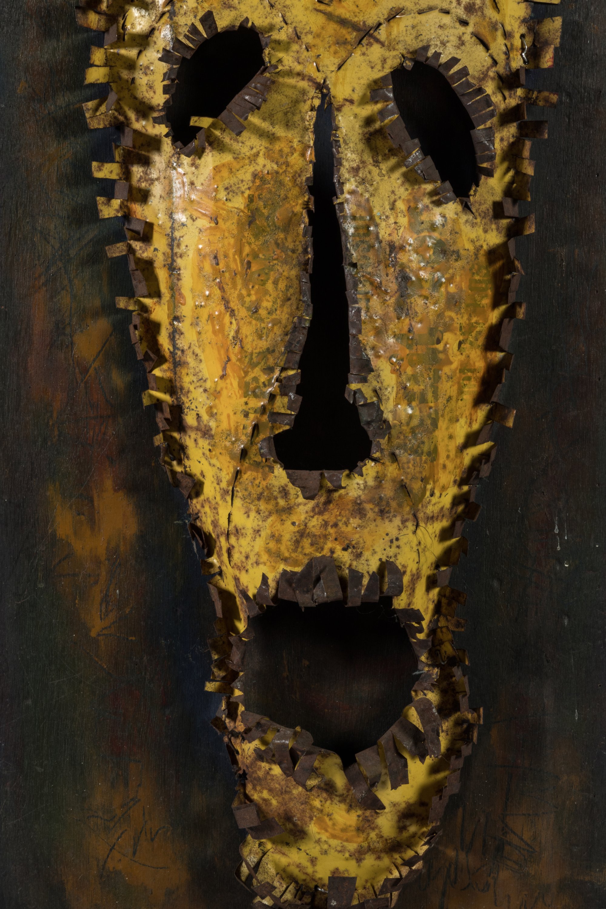 Bas-relief en tôle sur contreplaqué peint.