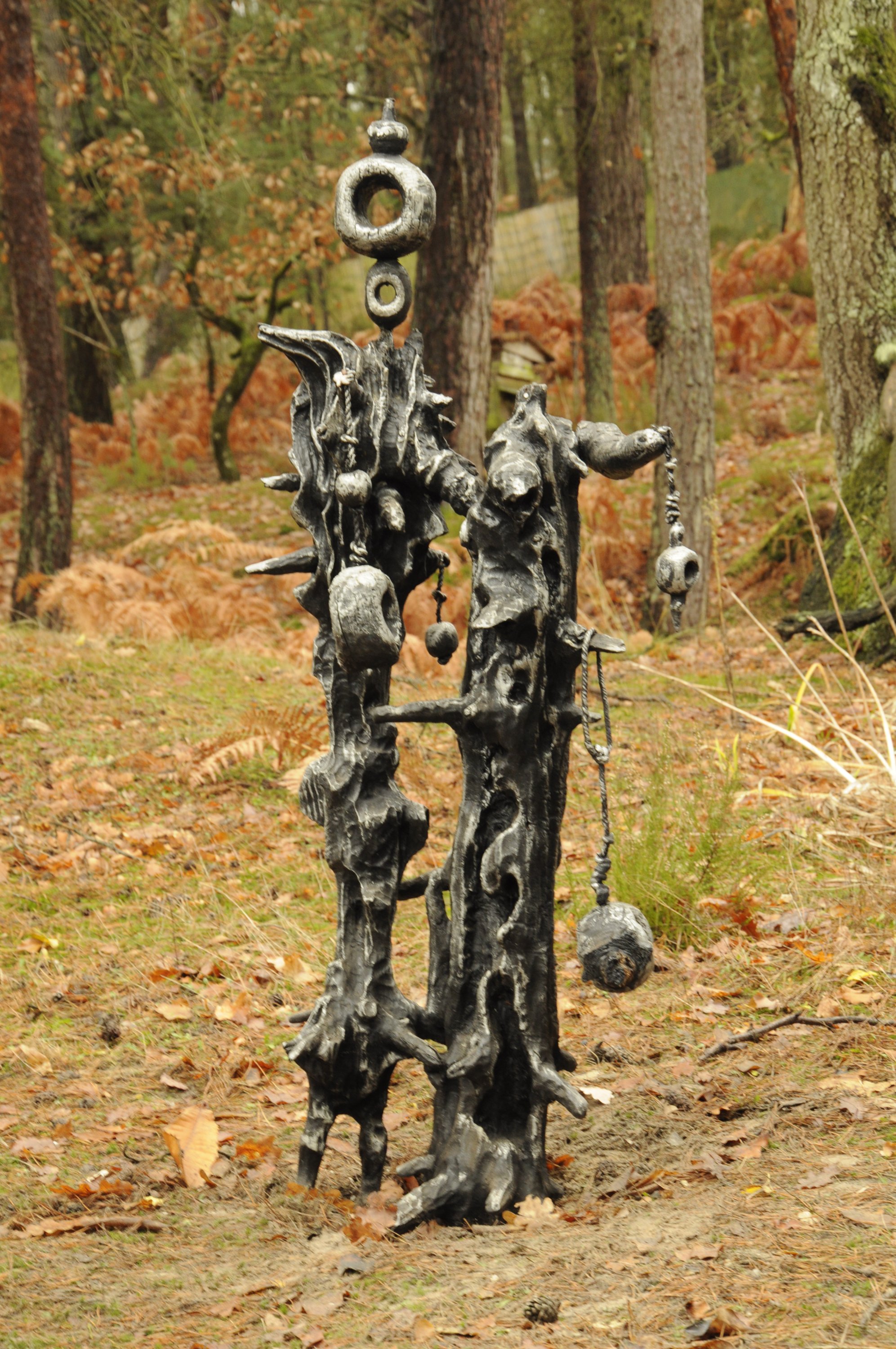 Bois brûlé, sculpté et peint, corde. Un élément mobile détachable