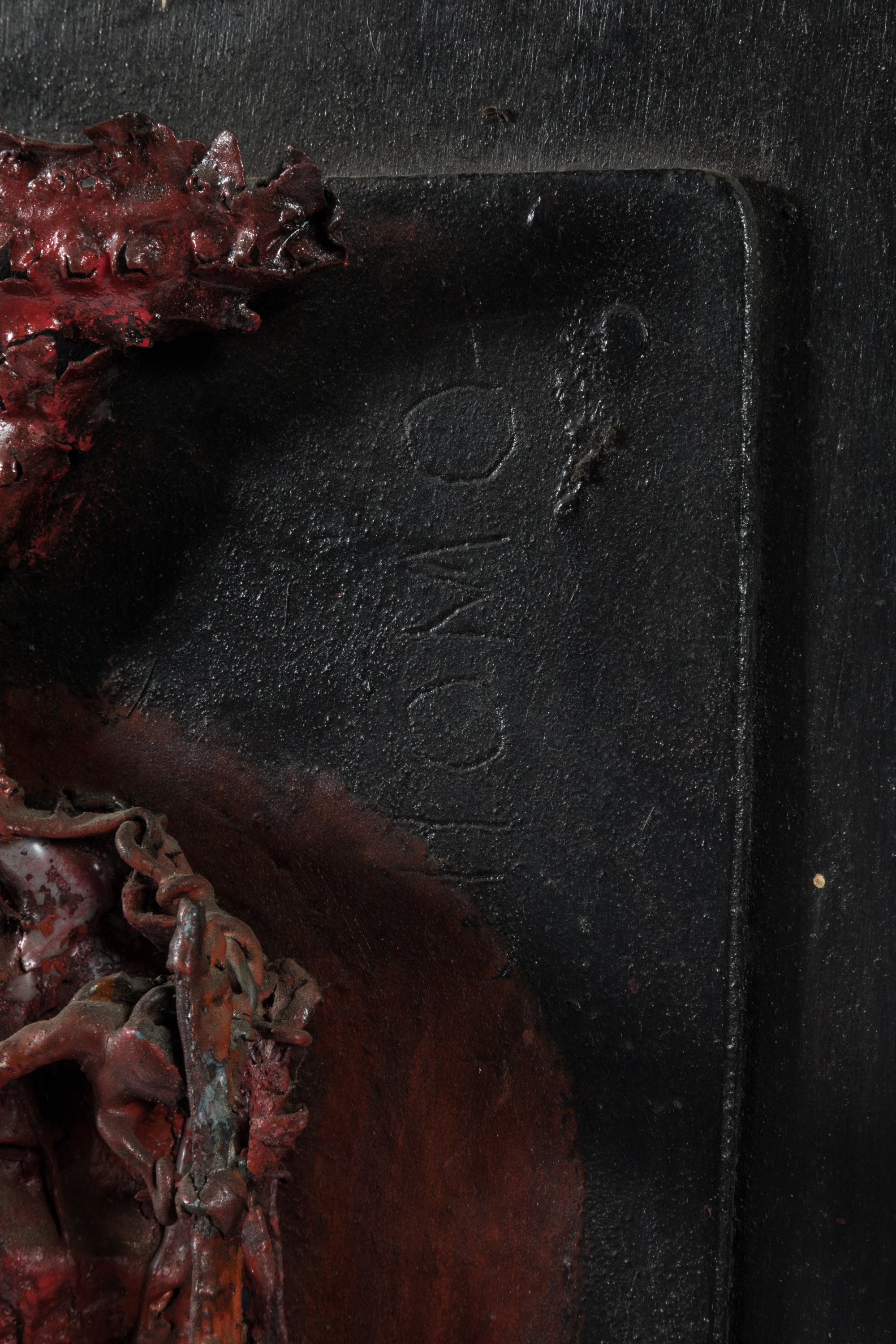 Haut-relief en tôle peinte sur bois.