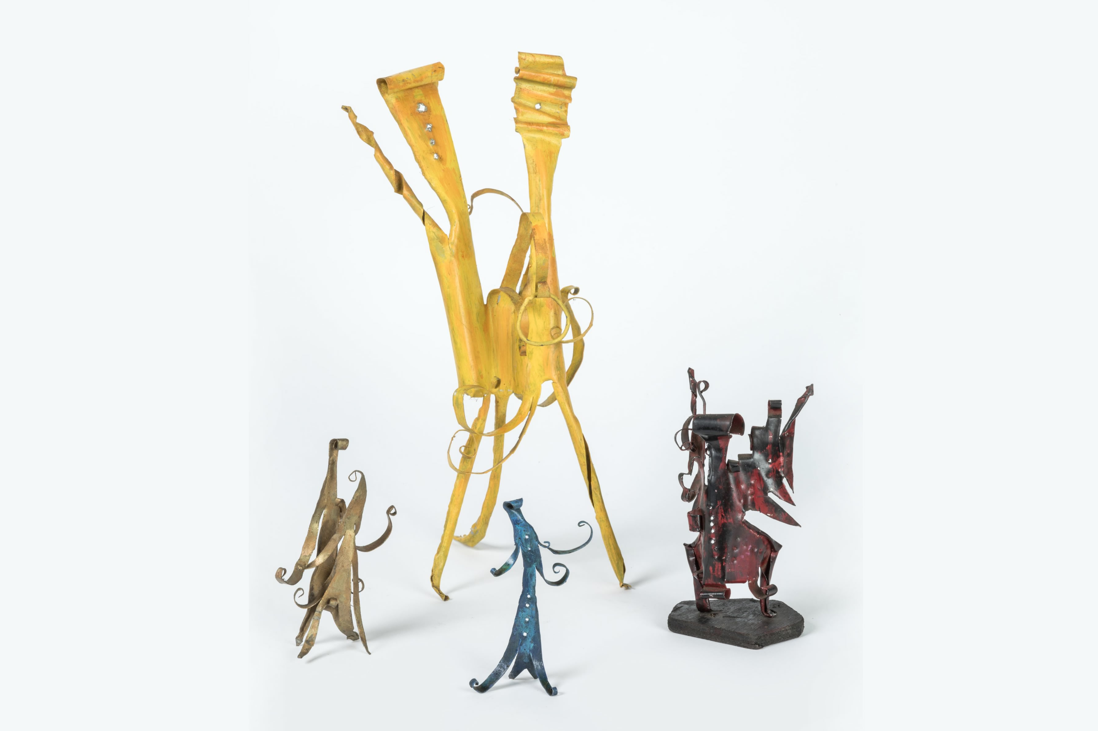 Quatre tôles découpées, peintes, décorées au marqueur.