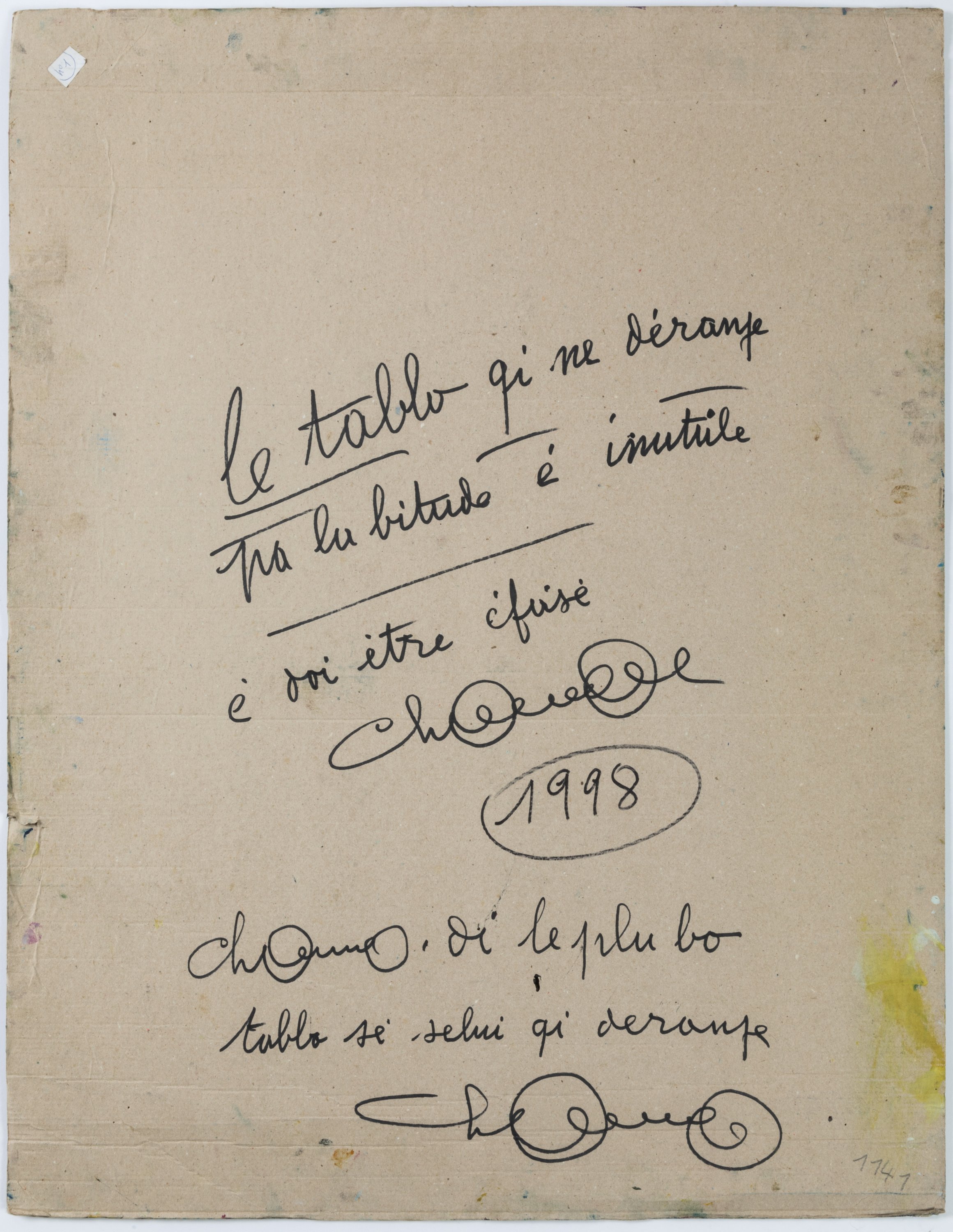 Signée. Contresignée, titrée et datée au dos et légendée: "Le tablo qi ne déranje pa la bitude é inutile é doi étre éfasé".