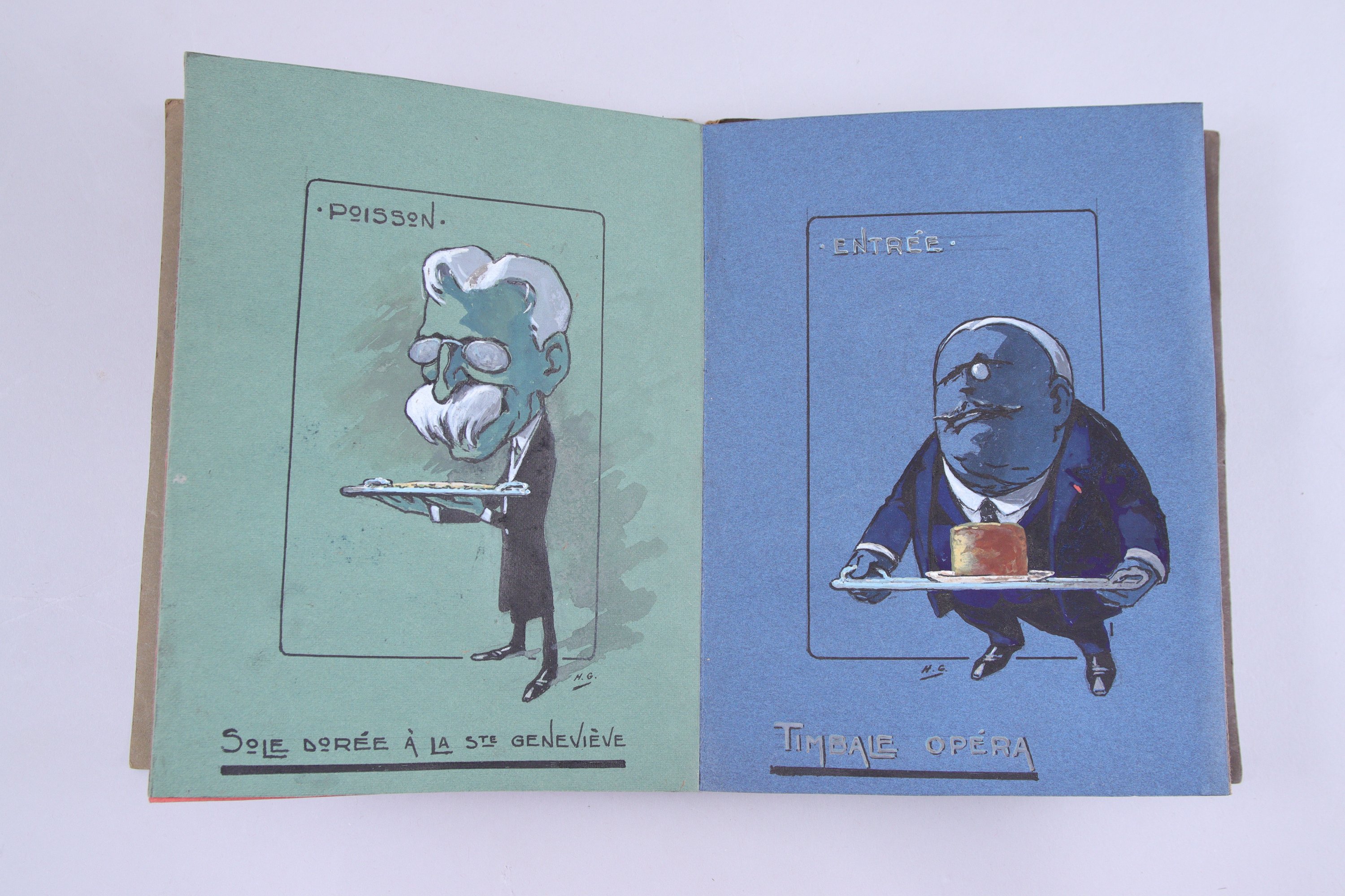 Huit portraits-charges à la gouache figurant Maurice Davanne, Auguste Erhard, Paul Bonhomme, Elie Poirée, Antoine Banès, Henri Boutet, Henry Gray et Georges Lamouroux. Réunis en accordéon avec légende, dédicace et signatures des convives.