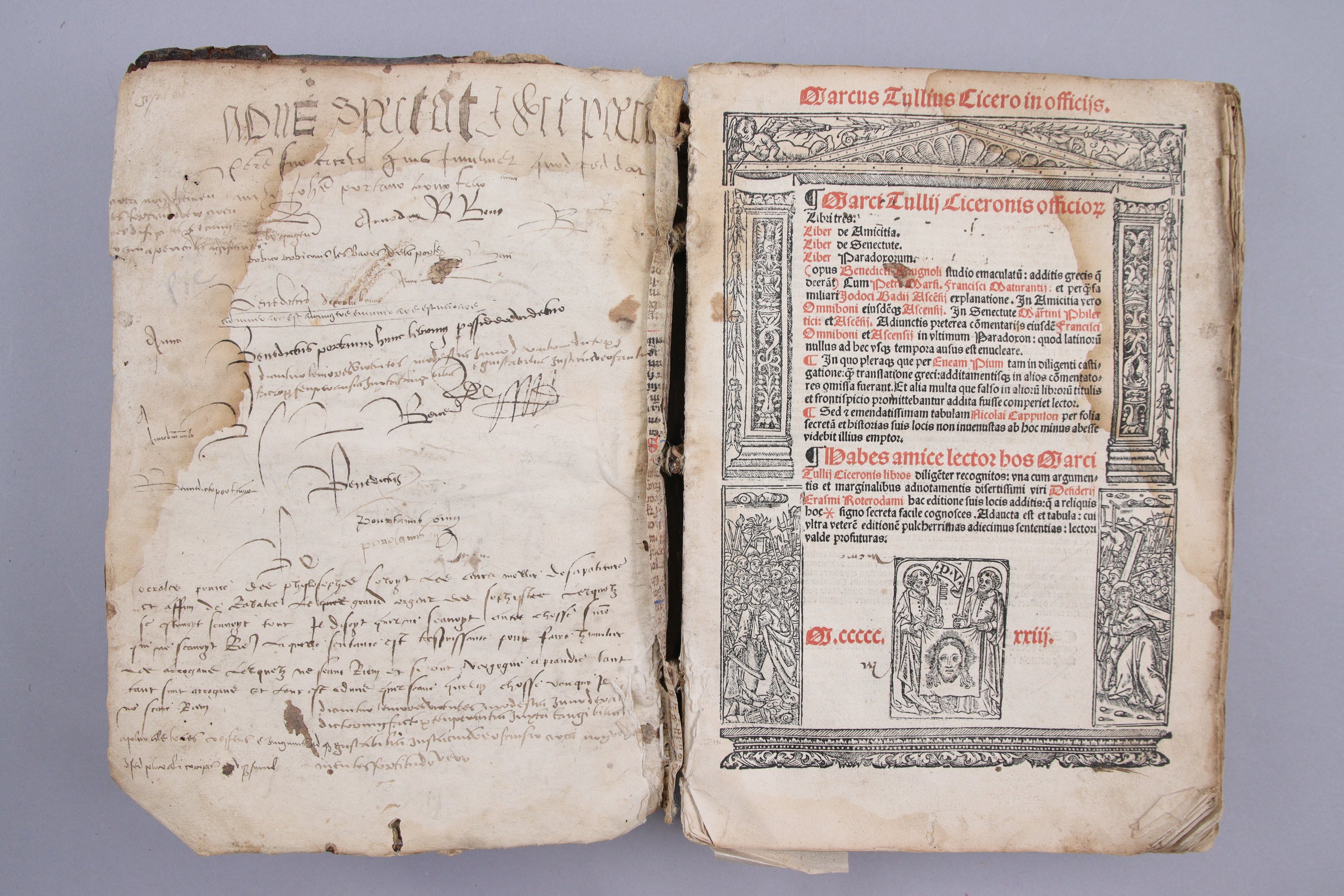 Rare impression de Simon Vincent en caractères gothiques. Titre avec portique en rouge et noir ; lettrines ; 5 bois gravés. Notes et remarques d'Erasme, sur un texte établi en particulier par Josse Bade .Achevé d'imprimer le 27 janvier 1523.